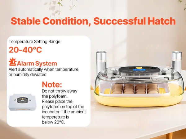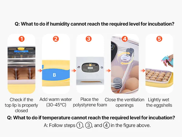 P2: ¿Cuáles son las precauciones para la eclosión? A2: 1. Coloque la máquina en espuma si la temperatura ambiente es inferior a 20 °C. 2. No abra la tapa con frecuencia durante la incubación, ya que hará que la cáscara del huevo intacta se seque y sea difícil de romper.