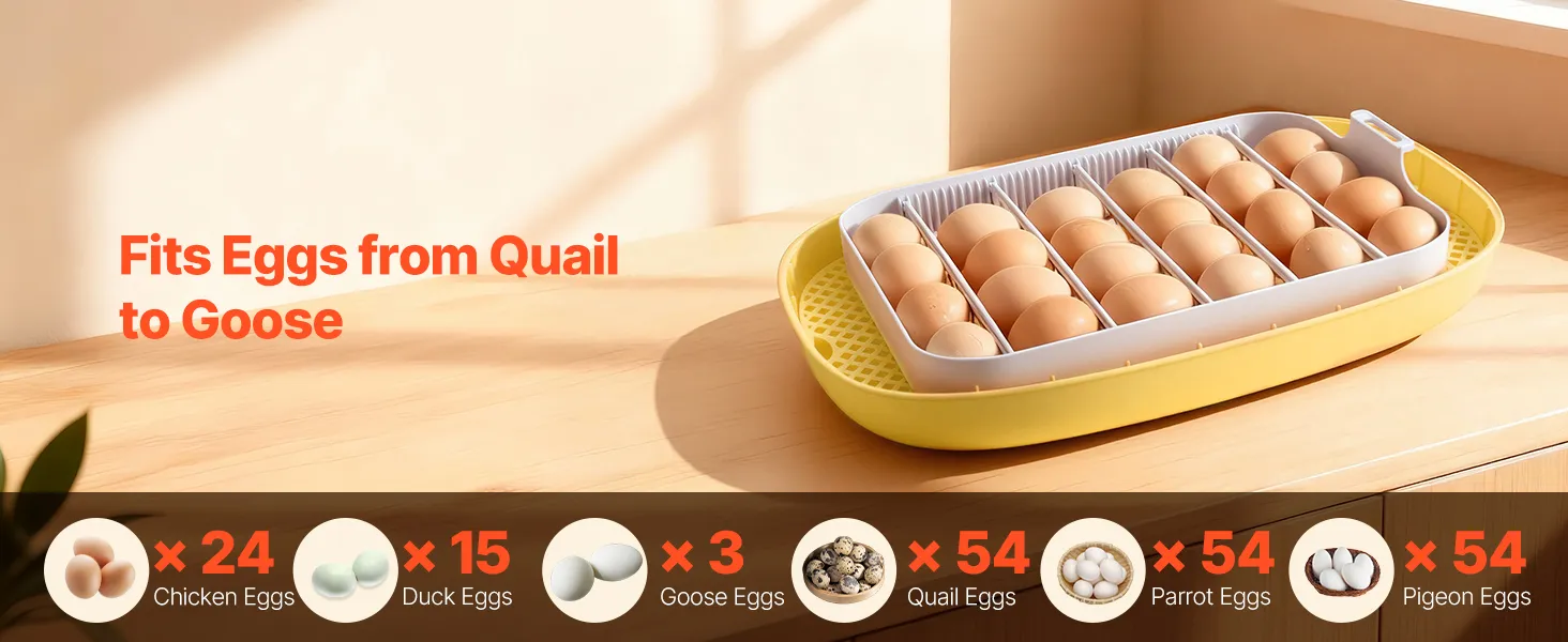 Espaciado ajustable entre huevos: Nuestra incubadora de huevos de pato se adapta a varios tipos de huevos y puede contener hasta 24 huevos de gallina, 15 huevos de pato, 3 huevos de ganso o 54 huevos más pequeños, como huevos de codorniz