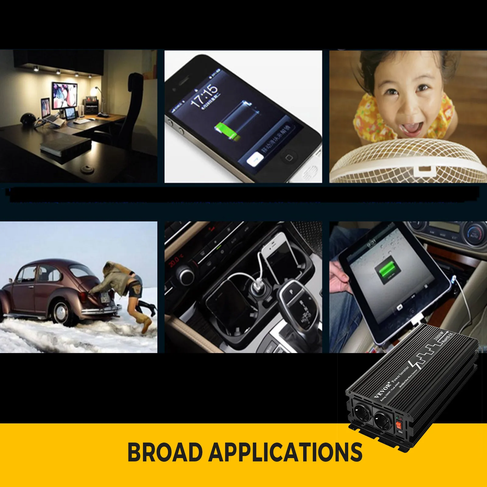 Nuestro inversor de corriente onda sinusoidal modificada transforma la energía de DC en AC, que puede alimentar productos domésticos como licuadora, refrigerador y más,incluso automóviles. La salida continua es de 2000W y la potencia máxima de 4000W. También se incluye el mando a distancia.