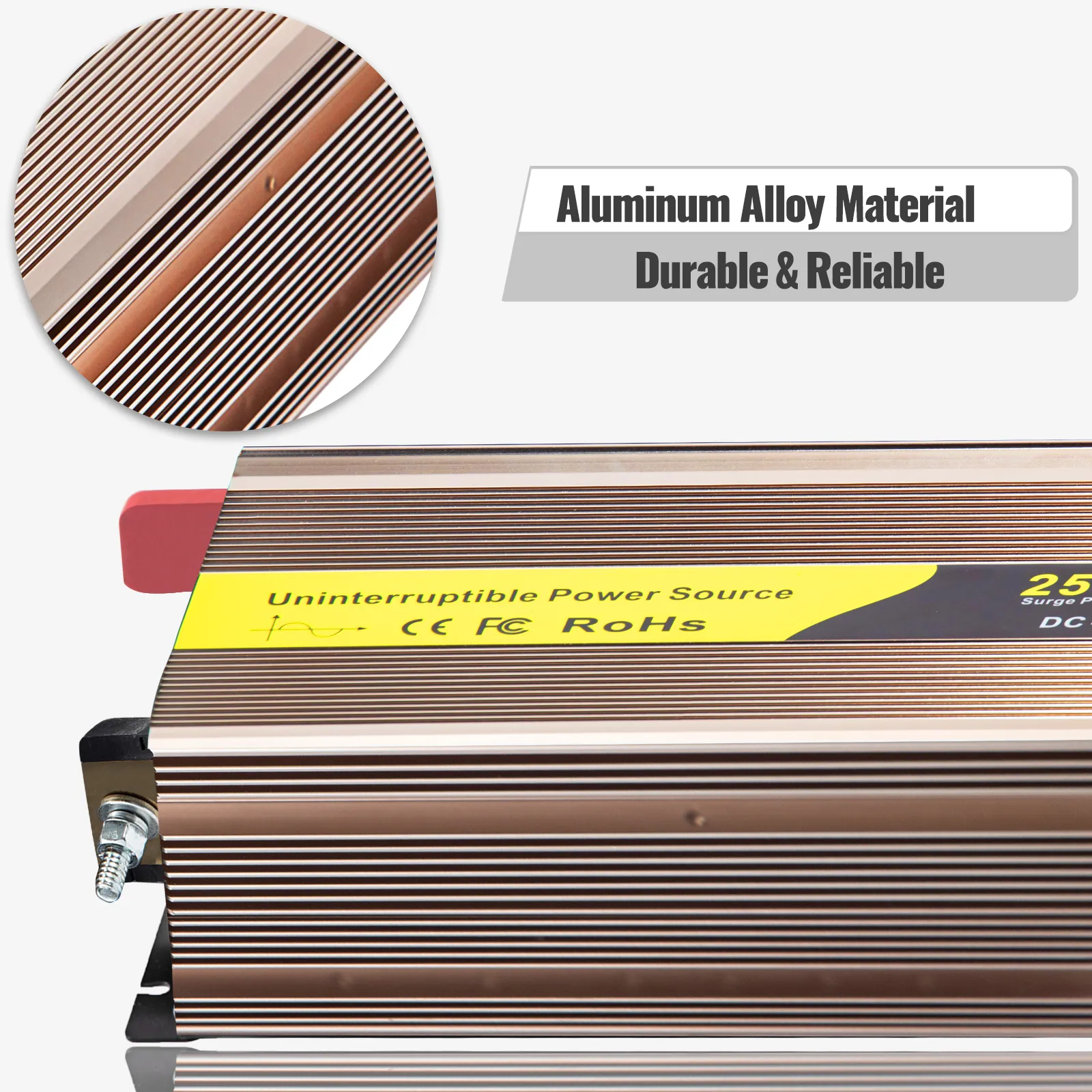 Este inversor de energía está hecho de material de aleación de aluminio, que es capaz de resistir la oxidación, la compresión, la vibración y la deformación. Una ligera caída o impacto no afectará las partes internas.