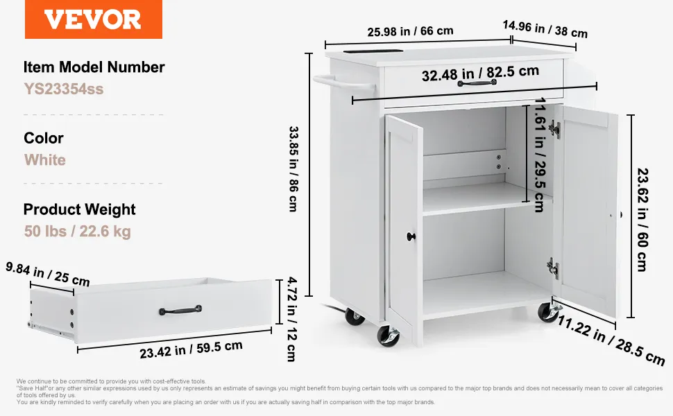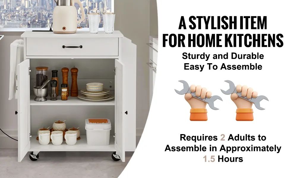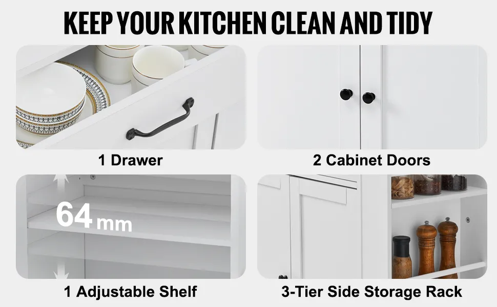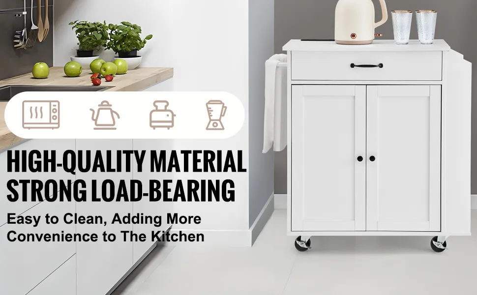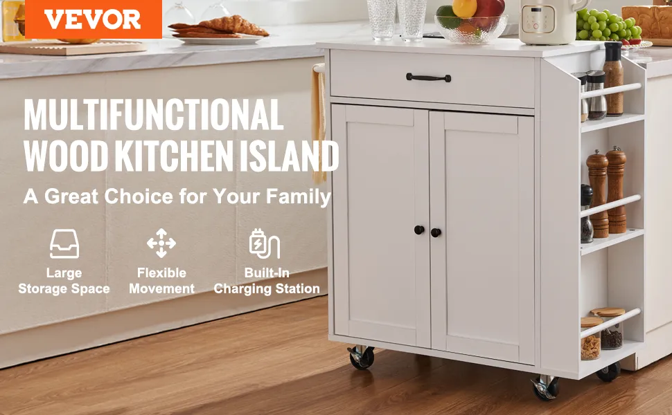 VEVOR - Isla de cocina portátil con ruedas, carrito de 32" con armario de almacenamiento, mesa con ruedas y toma de corriente, especiero, toallero, estante ajustable, cajón, islas portátiles con ruedas para comedor y sala de estar, color blanco