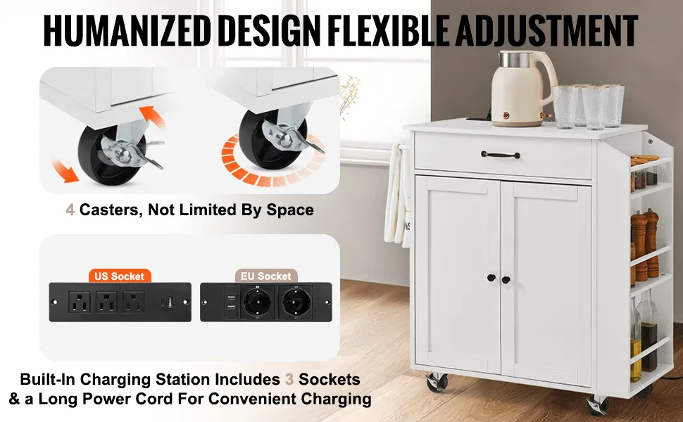 Cuatro ruedas giratorias de 360 grados, 2 de las cuales se pueden bloquear, hacen que este carrito de cocina sea fácil de mover o mantener fijo. Los estantes ajustables brindan un espacio de almacenamiento flexible. Viene con una estación de carga para mayor comodidad.