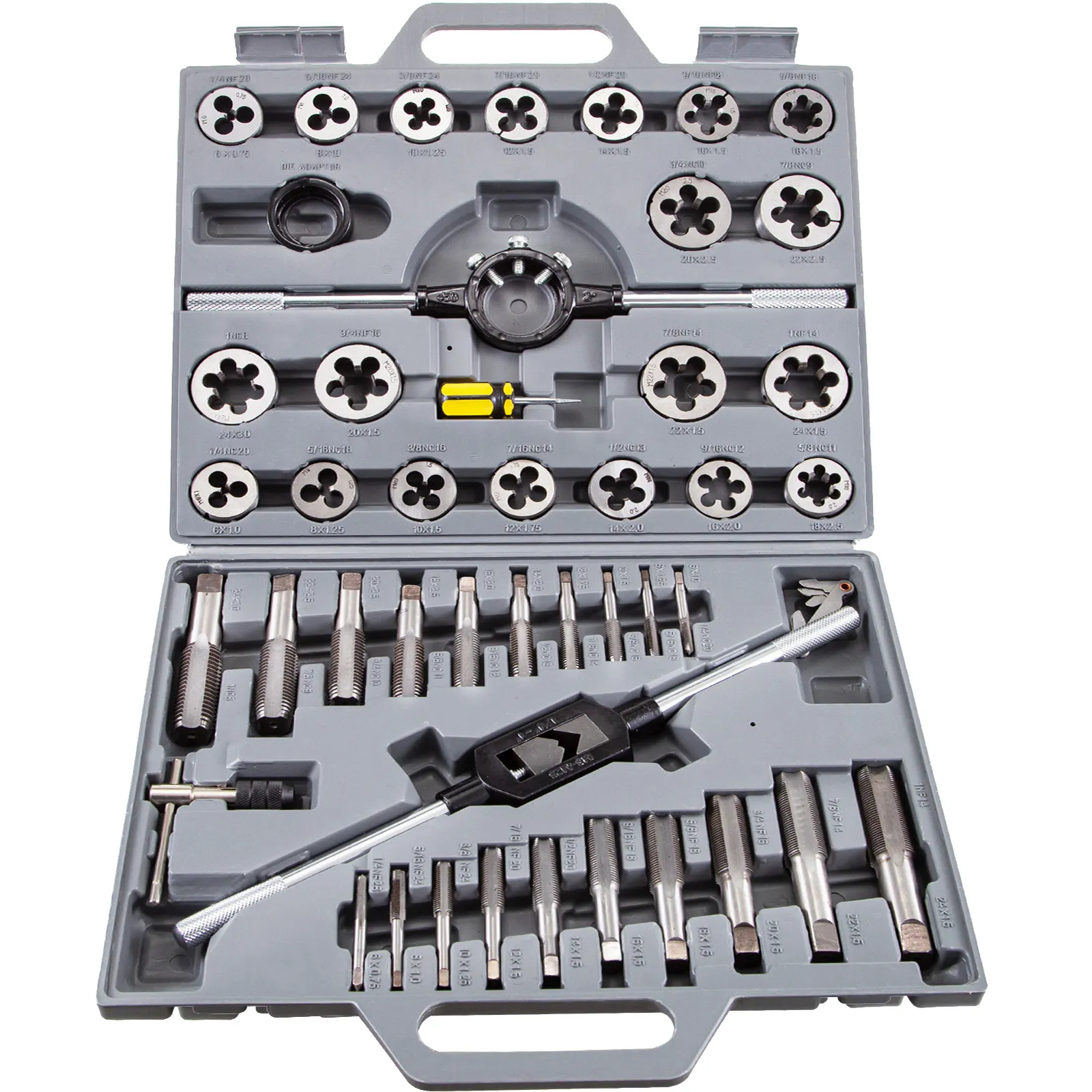 El juego de machos y matrices de 45 piezas (pulgadas) está hecho de acero al carbono. Incluye 20 machos y 20 matrices. Varían de 3/4 de pulgadas a 3 pulgadas. Estos machos de roscar y matrices de tapón cónico son el estilo más utilizado. Podemos usarlos para cortar material nuevo o perseguir hilos ligeramente dañados. Estos machos de roscar y troqueles cortan acero al carbono y aleado, acero inoxidable, hierro fundido, aluminio, latón y bronce.