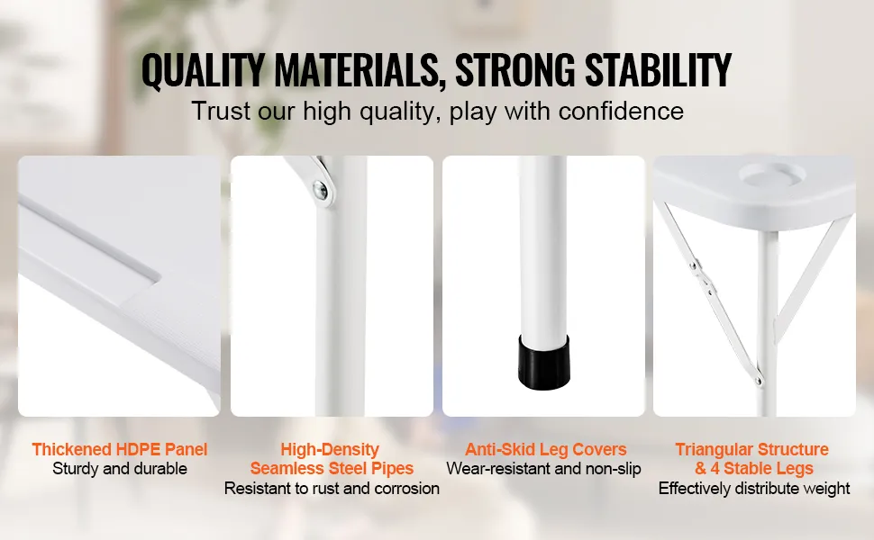 Resistente y duradero: nuestra mesa de cartas plegable para 4 jugadores está hecha de polietileno de alta densidad(HDPE), duradero e impermeable. Su tubo de acero sin costura de alta densidad es resistente al óxido, mientras que las almohadillas antideslizantes mejoran la estabilidad, reducen el ruido y resisten el desgaste. Con una excelente capacidad de carga, proporciona una excelente estabilidad durante el tiempo de juego.