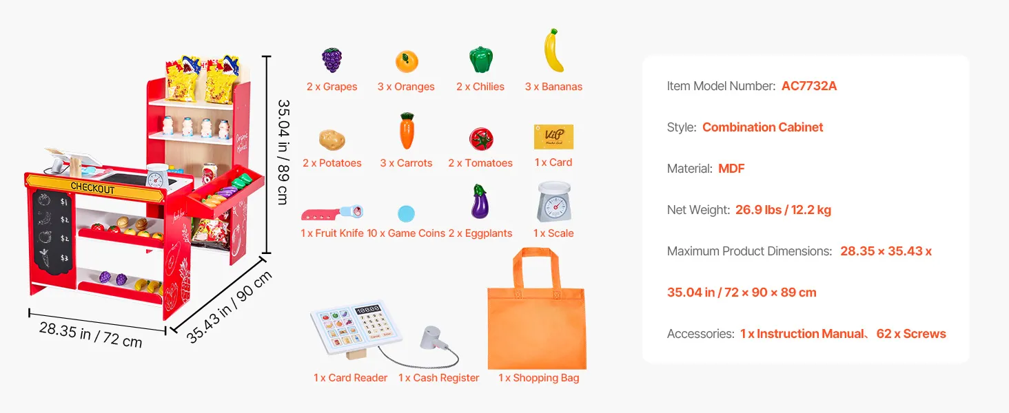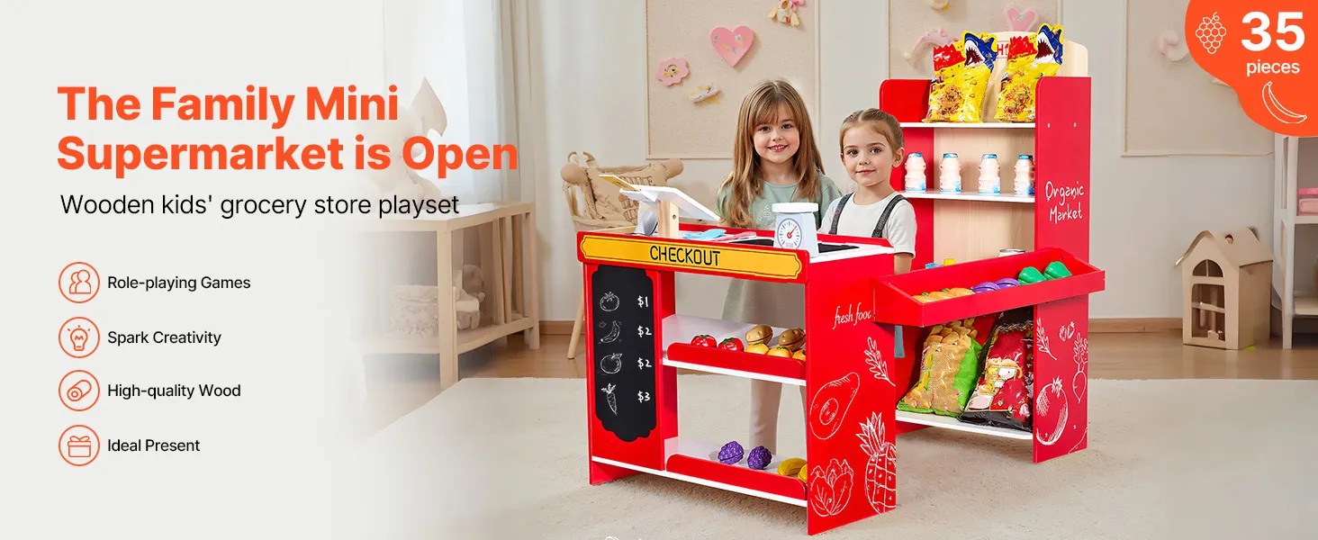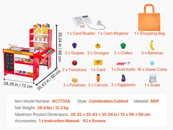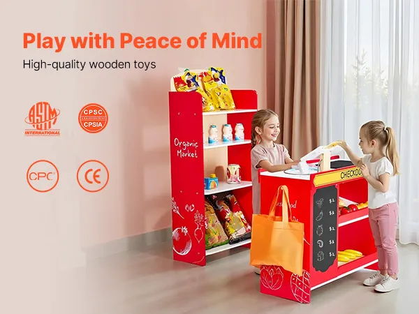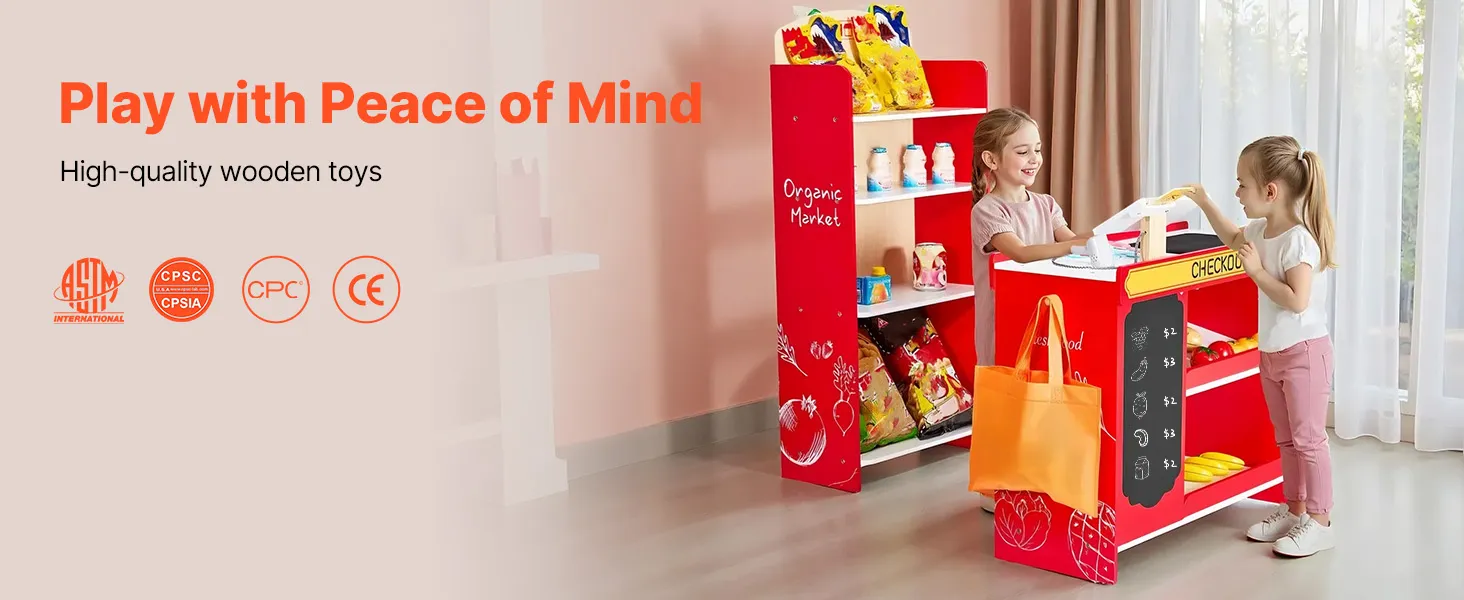 Madera de alta calidad: Nuestra tienda de comestibles de juego para niños está hecha con madera MDF, superficies lisas y una construcción duradera, segura para niños de más de 3 años y construida para durar