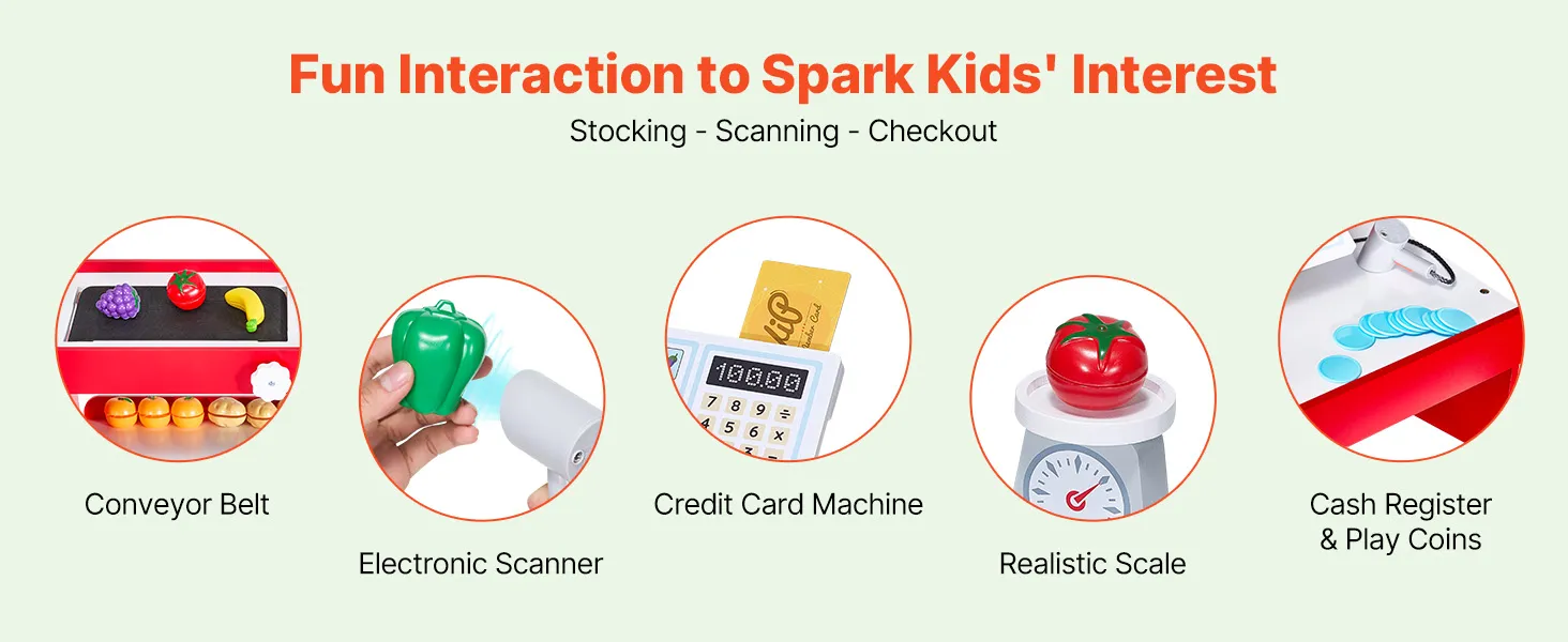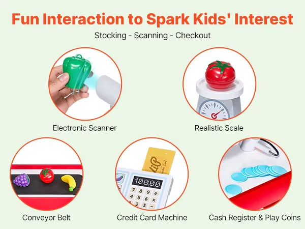Funciones interactivas: Nuestro juguete de tienda está equipado con una cinta transportadora móvil, un escáner y un lector de tarjetas. Así, los niños pueden escanear frutas y verduras y pagar como en una tienda real