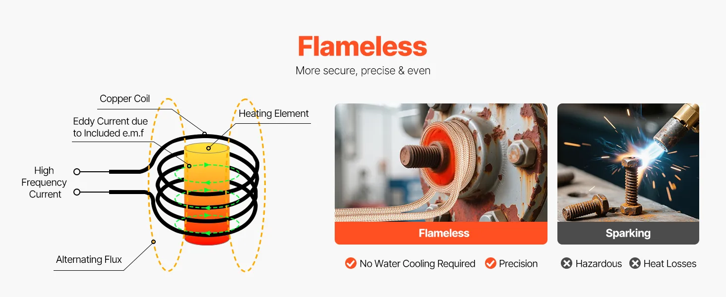 Quick Disassembly: High-frequency electromagnetic field heating with 1100W of power allows the metal to quickly expand within 30 seconds, making it easy to remove. The induction heater produces no flames, requires no water cooling