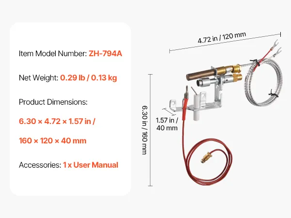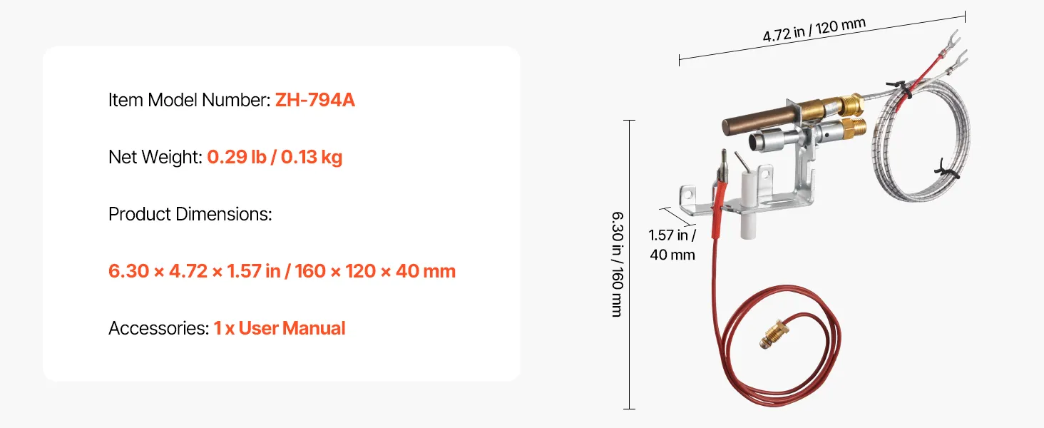 Conjunto de encendido: Este conjunto de piloto de gas cuenta con un electrodo, un termopar de 84 cm y una termopila de 50 cm. Equipado con un tubo de alta calidad, cableado resistente al calor y un soporte robusto, garantiza un calentamiento estable y resistente a la corrosión