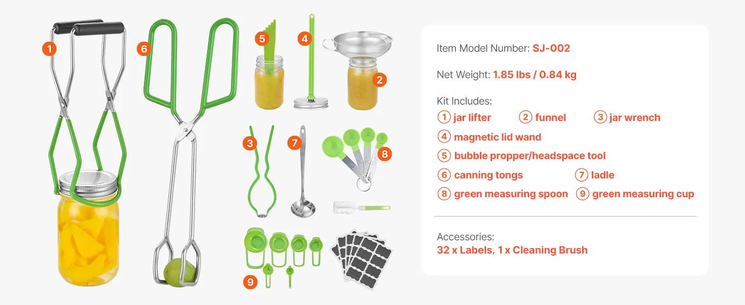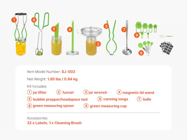 Kit completo: El kit básico de 9 piezas para enlatar incluye todas las herramientas esenciales para enlatar, incluyendo un elevador de frascos, un embudo, una llave para frascos, una varilla magnética para tapas, un abridor de burbujas/herramienta para espacio libre, pinzas para enlatar, un cucharón, una cuchara medidora verde y una taza medidora verde. Además, incluye etiquetas y un cepillo de limpieza, así que todo lo que necesita está incluido en un solo paquete