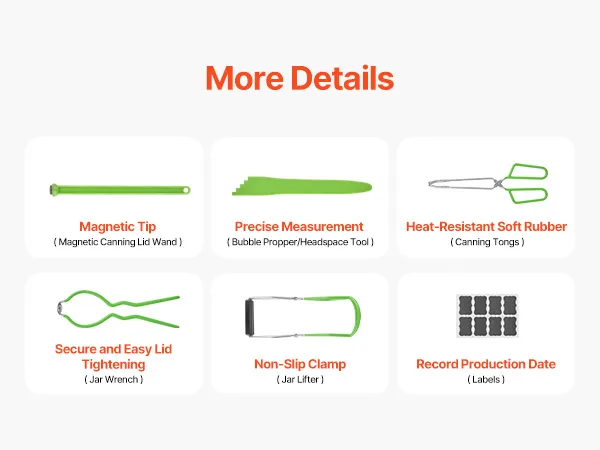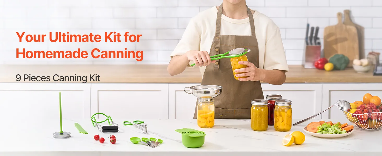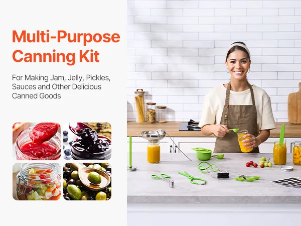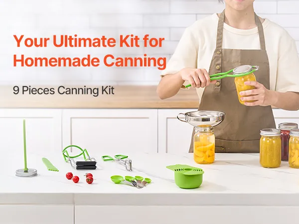 Nuestro kit básico de suministros para conservas incluye herramientas esenciales completas, como una llave para frascos, un elevador de frascos y otros artículos prácticos, para satisfacer todas sus necesidades de conservas caseras.