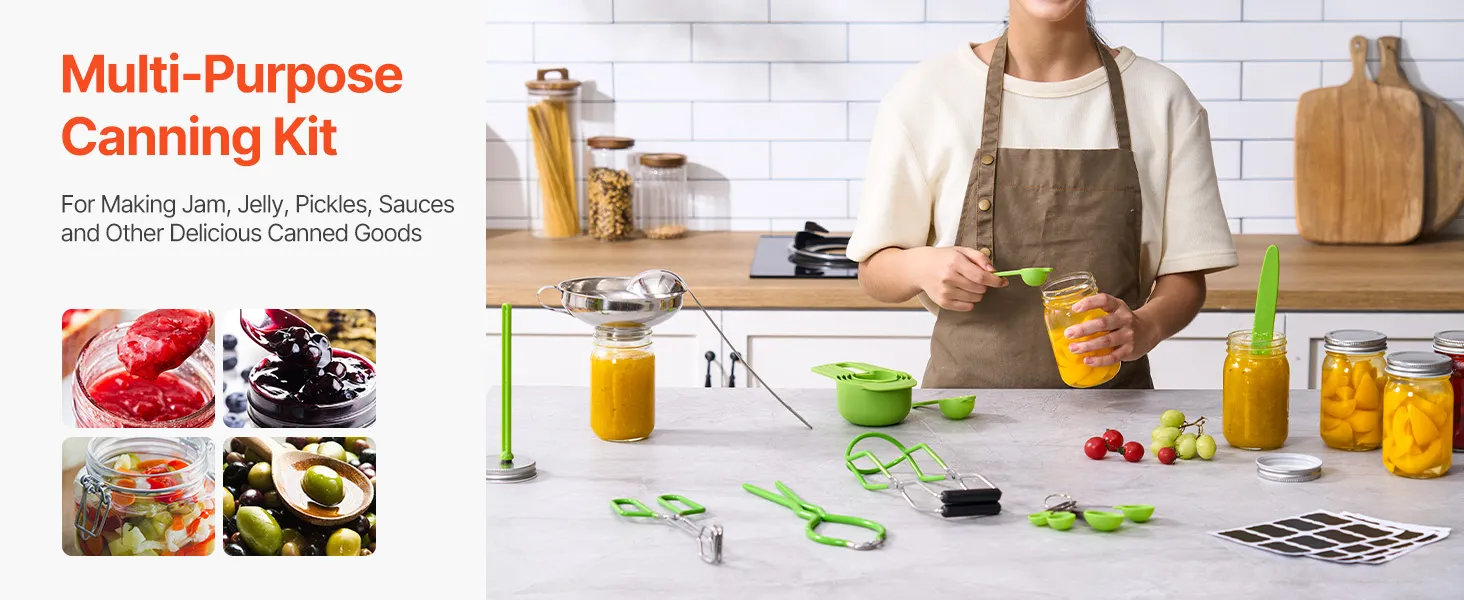 VEVOR Kit de Inicio de Suministros para Enlatado al Baño María, Acero Inoxidable, con Cucharón, Cuchara y Taza Medidoras, Embudo, Pinzas, Elevador de Frascos, Llave a Frascos, 285 x 165 x 105 mm