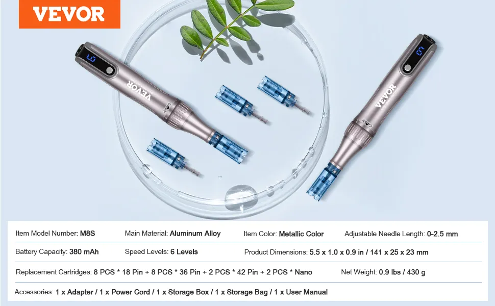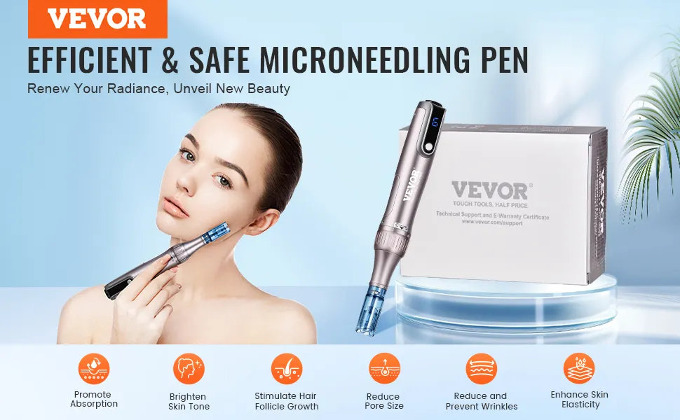 Mejore su piel con la pluma de microagujas VEVOR M8S, diseñada para aumentar la absorción del producto, aclarar el tono de la piel, iluminar los poros y mejorar la elasticidad de la piel. Ya sea que esté tratando la piel apagada o las líneas finas, este lápiz proporciona mejoras notables.