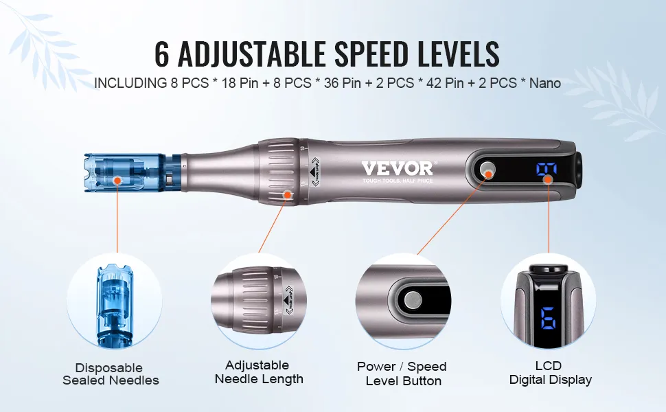 Revela tu brillo: El lápiz de microagujas profesional VEVOR M8S mejora el tejido de la piel, aumenta la absorción del producto, aclara cicatrices y manchas de la edad y mejora la elasticidad de la piel. Viene con 8 piezas * 18 pines + 8 piezas * 36 pines + 2 piezas * 42 pines + 2 piezas * nano cartuchos antirreflujo para reemplazo, ideal para tratar cicatrices de acné, manchas amarillentas, manchas de pigmentación y arrugas.