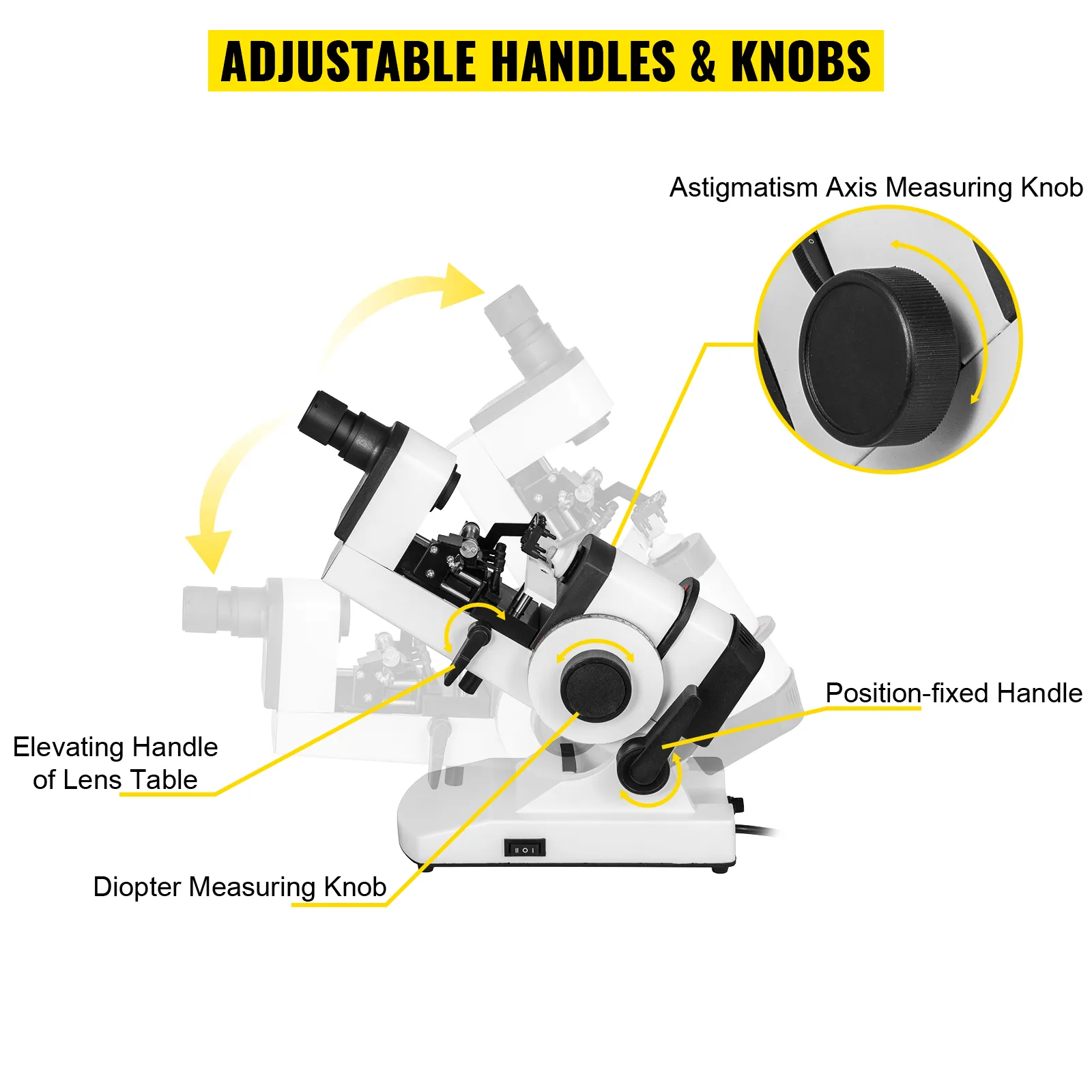 El focómetro manual de VEVOR, fácil de operar, nítido en la imagen, y estable en el rendimiento, puede analizar una variedad de objetos relacionados con la óptica, tales como la lente esférica o la dioptría de la lente cilíndrica de las gafas, el eje de astigmatismo de la lente cilíndrica, la dioptría del prisma y la dirección de la base, etc. Es adecuado para el departamento de detección de mediciones de gafas, fábricas de procesamiento de gafas, fábricas de elementos ópticos, etc.