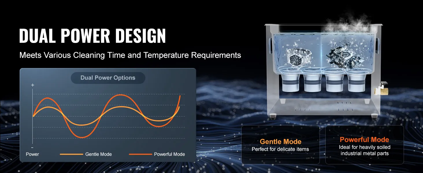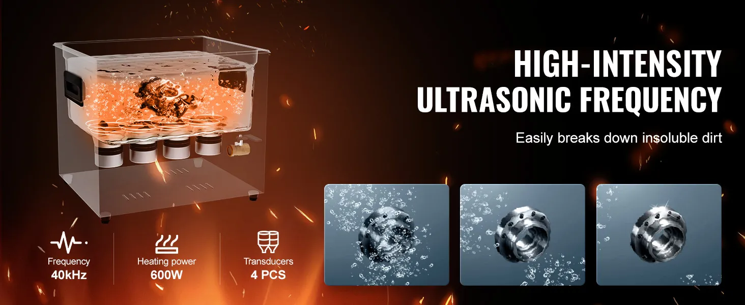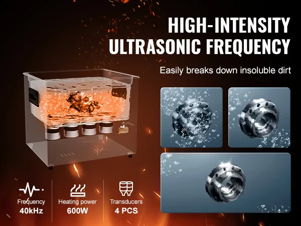 Con tecnología de transductor avanzada, las ondas ultrasónicas de 40 kHz crean millones de pequeñas burbujas que llegan profundamente a las superficies y grietas, eliminando la suciedad de manera eficaz sin dañar la apariencia o la calidad del artículo.