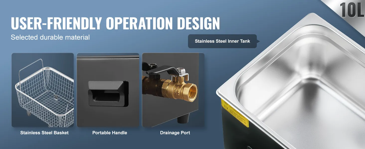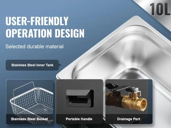 Diseño duradero y práctico: Fabricado en acero inoxidable 304 resistente a la corrosión, el limpiador cuenta con una cesta para evitar rayones y un asa portátil para un manejo sencillo. El sistema de drenaje simplifica el proceso de limpieza