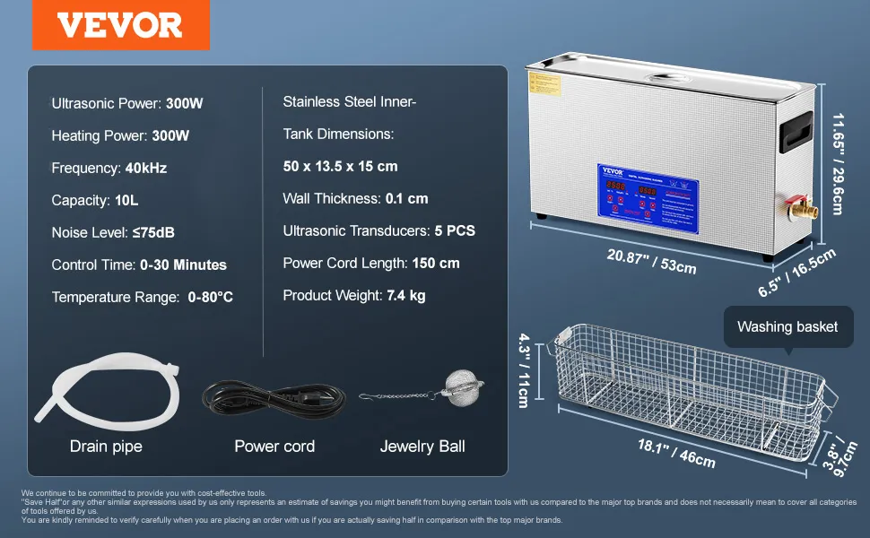 VEVOR Limpiador Ultrasónico 10 L Máquina de Limpieza Ultrasónica Profesional de 300 W con Temporizador y Calentador 40 kHz con Cesta para Piezas de Armas, Balas, Suministros Militares