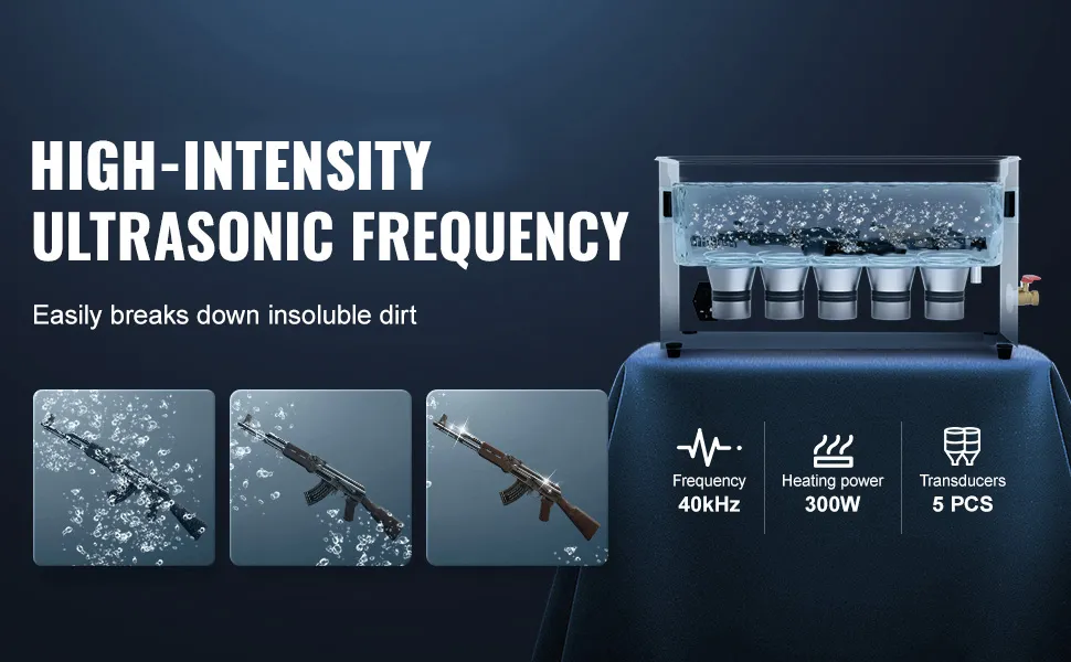 Potente rendimiento de limpieza: El limpiador de pistolas ultrasónico VEVOR funciona a una frecuencia ultra alta de 40 kHz, produciendo millones de pequeñas burbujas que explotan en el agua y liberan una poderosa energía de limpieza. Esta energía penetra cada grieta y elimina a fondo las manchas rebeldes de las piezas de las armas, sin dejar ninguna zona sin limpiar.