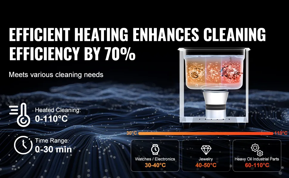 Limpieza con calor: Para diversos artículos como joyas, relojes/accesorios electrónicos y componentes industriales muy grasosos, puede regular la temperatura de limpieza de 0 a 80 °C para acelerar la disolución de la suciedad. Esto garantiza resultados de limpieza más eficientes y específicos. El modo de alta temperatura disuelve rápidamente la grasa rebelde, mientras que el modo de baja temperatura protege suavemente los materiales sensibles.