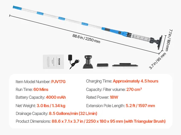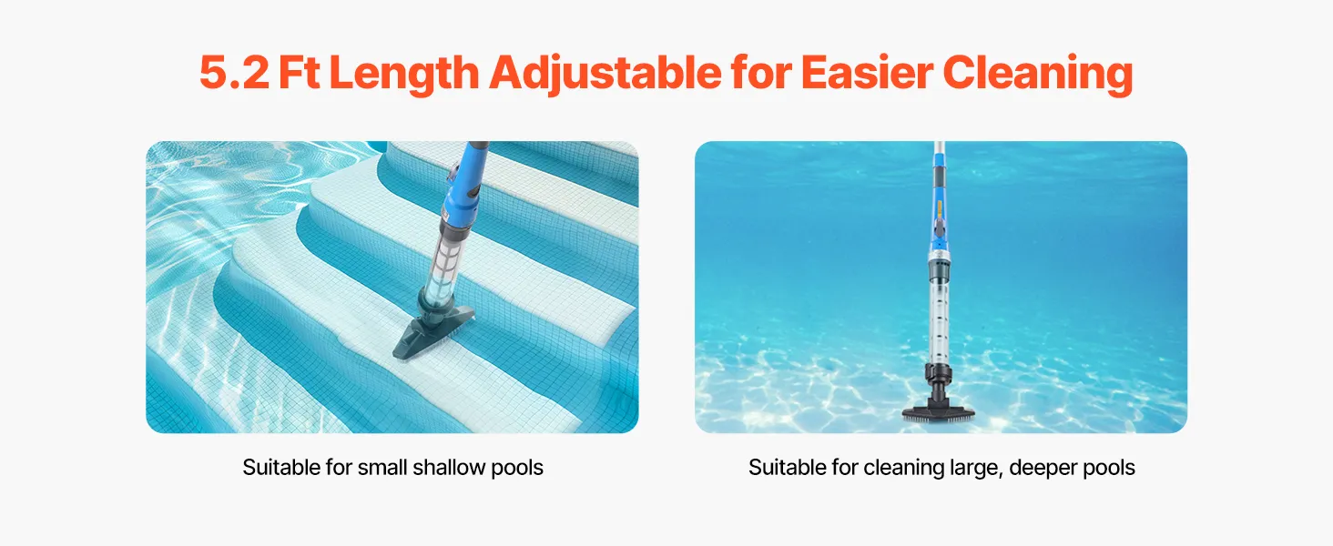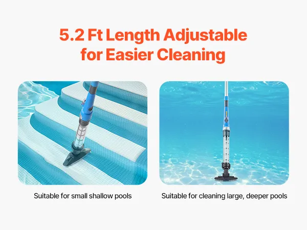 Longitud ajustable: Con cuatro postes de extensión, esta aspiradora inalámbrica para jacuzzi se puede ajustar hasta 1597 mm de longitud, lo que le permite limpiar áreas distantes sin esfuerzo. Las conexiones de los postes ajustadas de forma segura evitan fugas, lo que garantiza un mantenimiento duradero y eficiente de la piscina