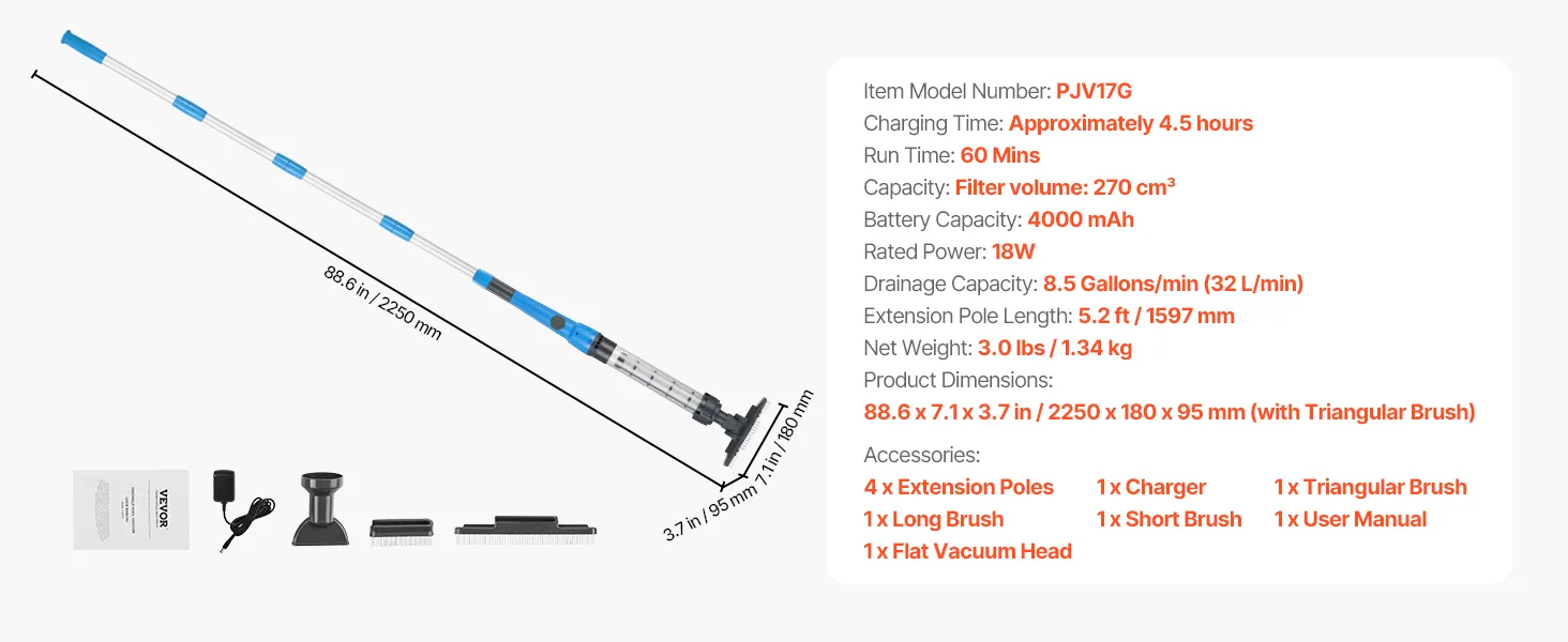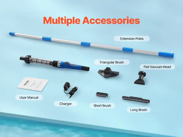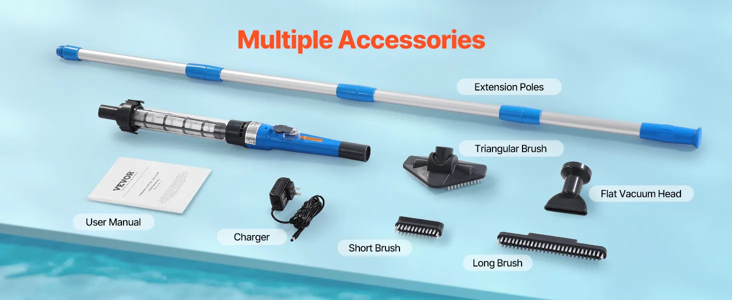 Este limpiador de piscinas recargable viene con múltiples accesorios, lo que lo hace ideal para piscinas elevadas, jacuzzis, spas, fuentes, peceras, escalones, paredes y más.