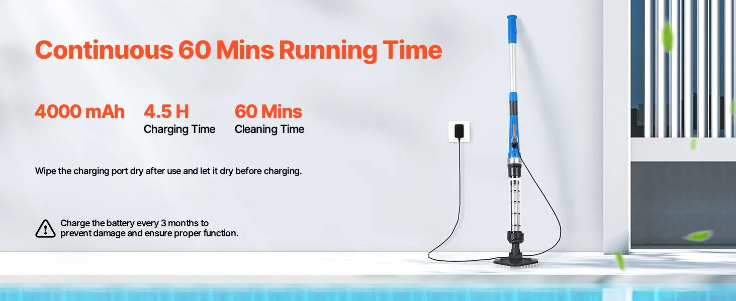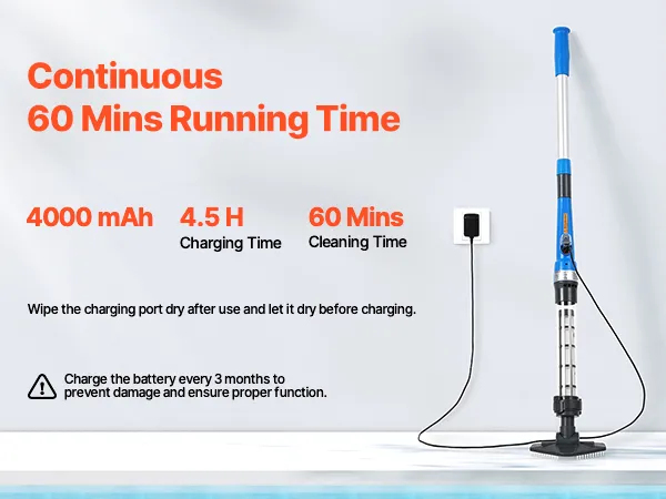 Con una batería incorporada de 4000 mAh, esta aspiradora de piscina recargable proporciona hasta 60 minutos de tiempo de funcionamiento con una carga completa, lo que le brinda tiempo suficiente para limpiar toda su piscina sin la molestia de los cables de alimentación.