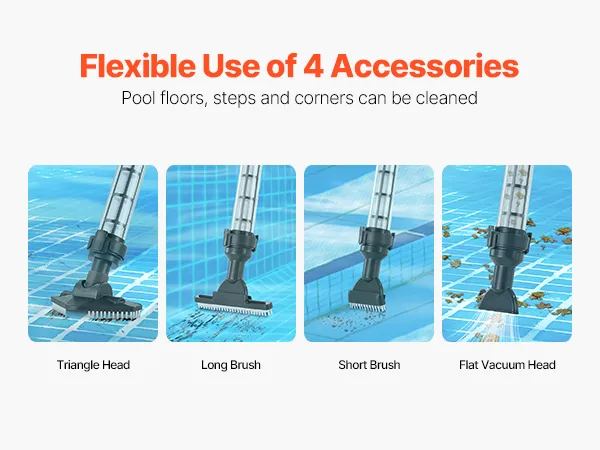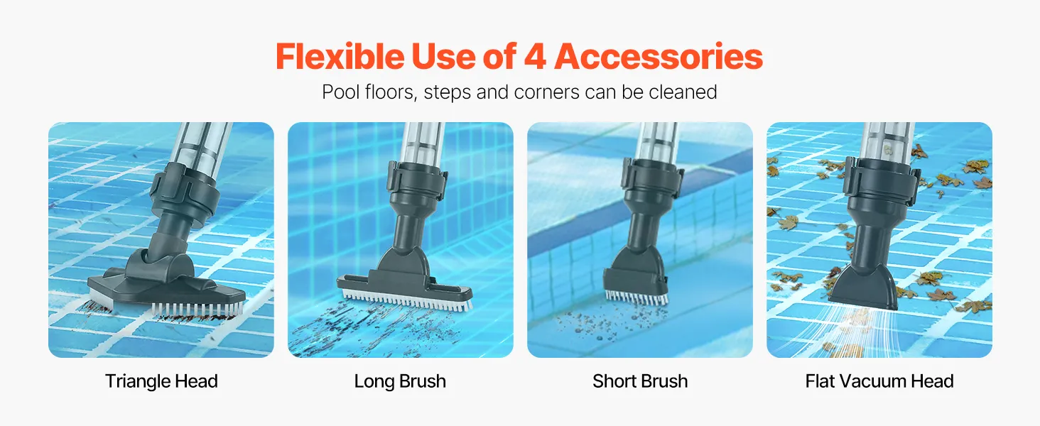Esta aspiradora de mano para piscinas viene con cuatro cabezales de cepillo (cepillo triangular, cepillo largo, cepillo corto y boquilla de succión), lo que garantiza una limpieza sin esfuerzo de escaleras de la piscina, esquinas y lugares difíciles de alcanzar.
