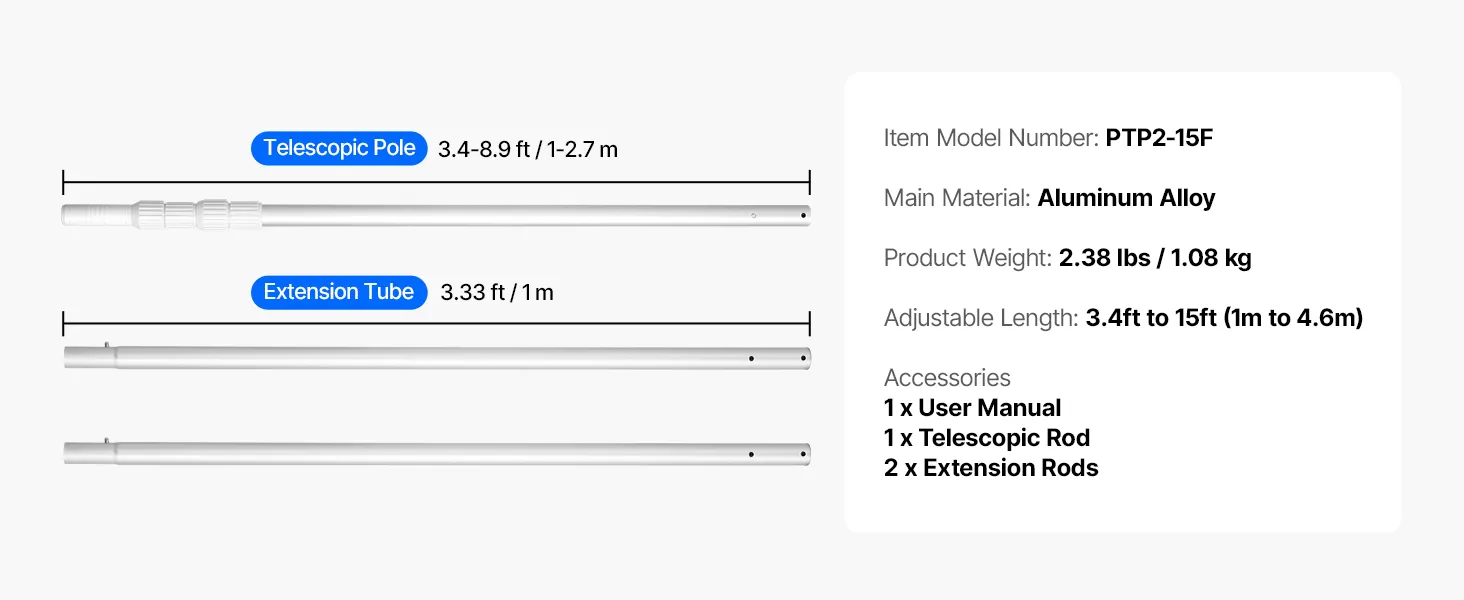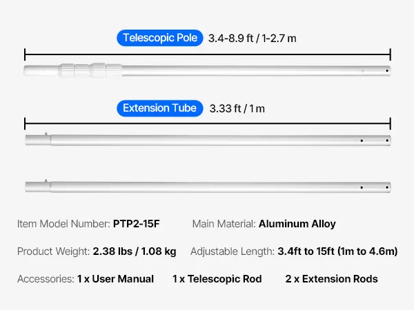 Nuestra pértiga de aleación de aluminio ligera pero duradera, se extiende de 1 a 4,6 m, ideal para piscinas de diferentes tamaños y profundidades de limpieza. El conector estándar de 1,4 pulgadas es compatible con redes desnatadoras, cepillos, cabezales de aspiración y otras herramientas.