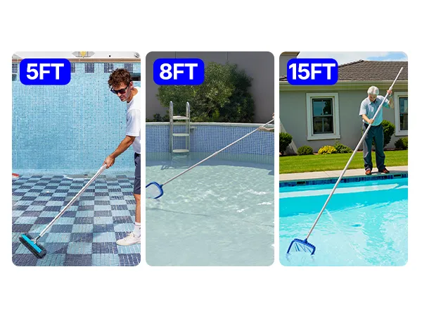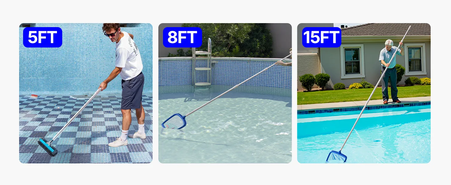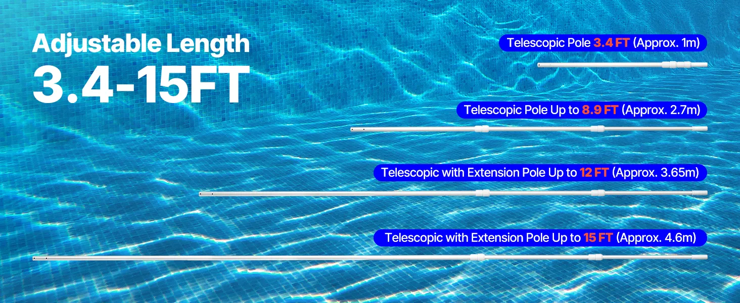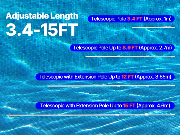 Nuestro poste de piscina se extiende de 1 a 4,6 m, lo que proporciona un alcance fácil a través de diferentes áreas de la piscina.