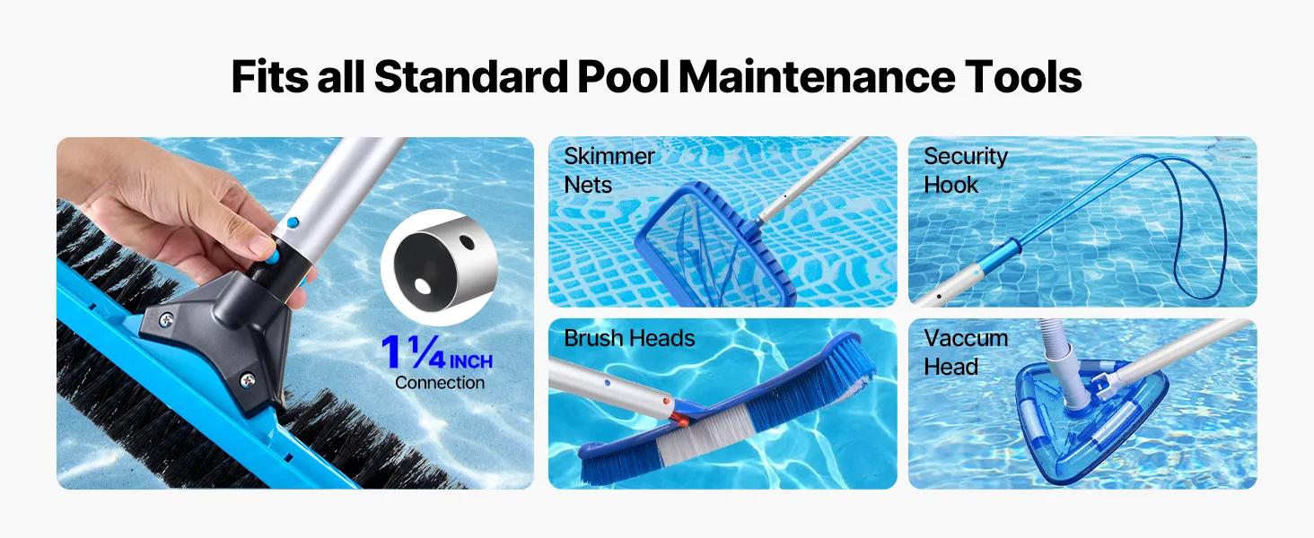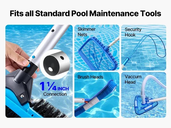 Tamaño de conexión estándar: El extremo de nuestro poste de piscina tiene un diseño estándar de 1¼ pulgadas y es compatible con la mayoría de las herramientas de limpieza de piscinas, como redes desnatadoras, cepillos y cabezales de aspiradora, sin necesidad de cambiar los postes con frecuencia