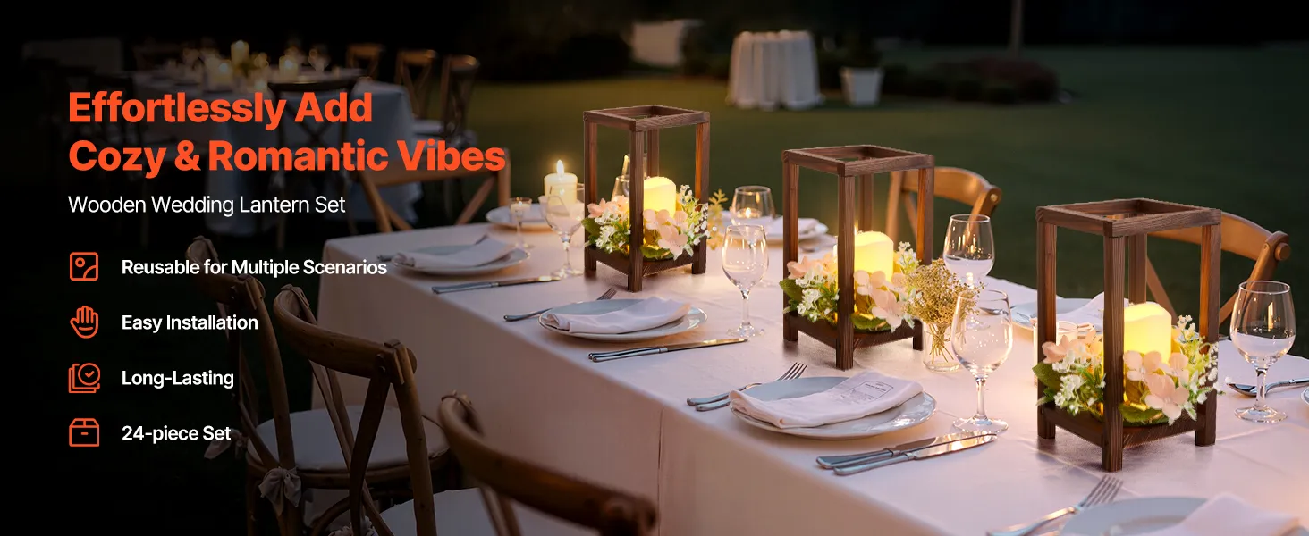 El farol de madera para bodas te ofrece todo lo necesario en un solo set. Incluye 24 piezas decorativas combinadas, lo que facilita su instalación. Gracias a su diseño sin llama para mayor seguridad, es reutilizable en diversas ocasiones, como bodas y festivales.