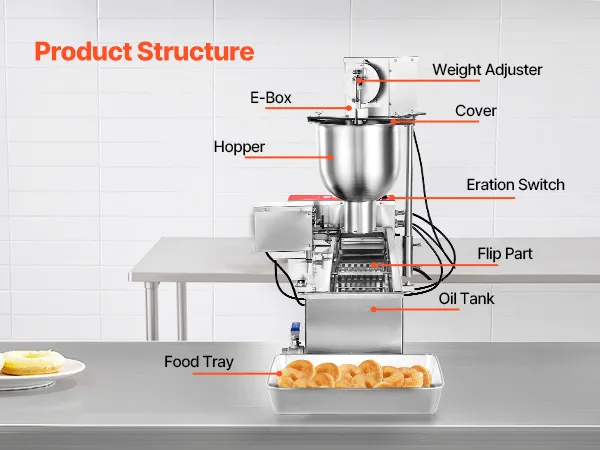 Acero inoxidable de grado alimenticio: Fabricada con acero inoxidable 304, esta máquina para freír donas es fácil de limpiar y mantener. Con una tolva de 5.5 L y un tanque de aceite de 14.5 L, está diseñada para una producción de alto volumen sin necesidad de rellenarlo constantemente