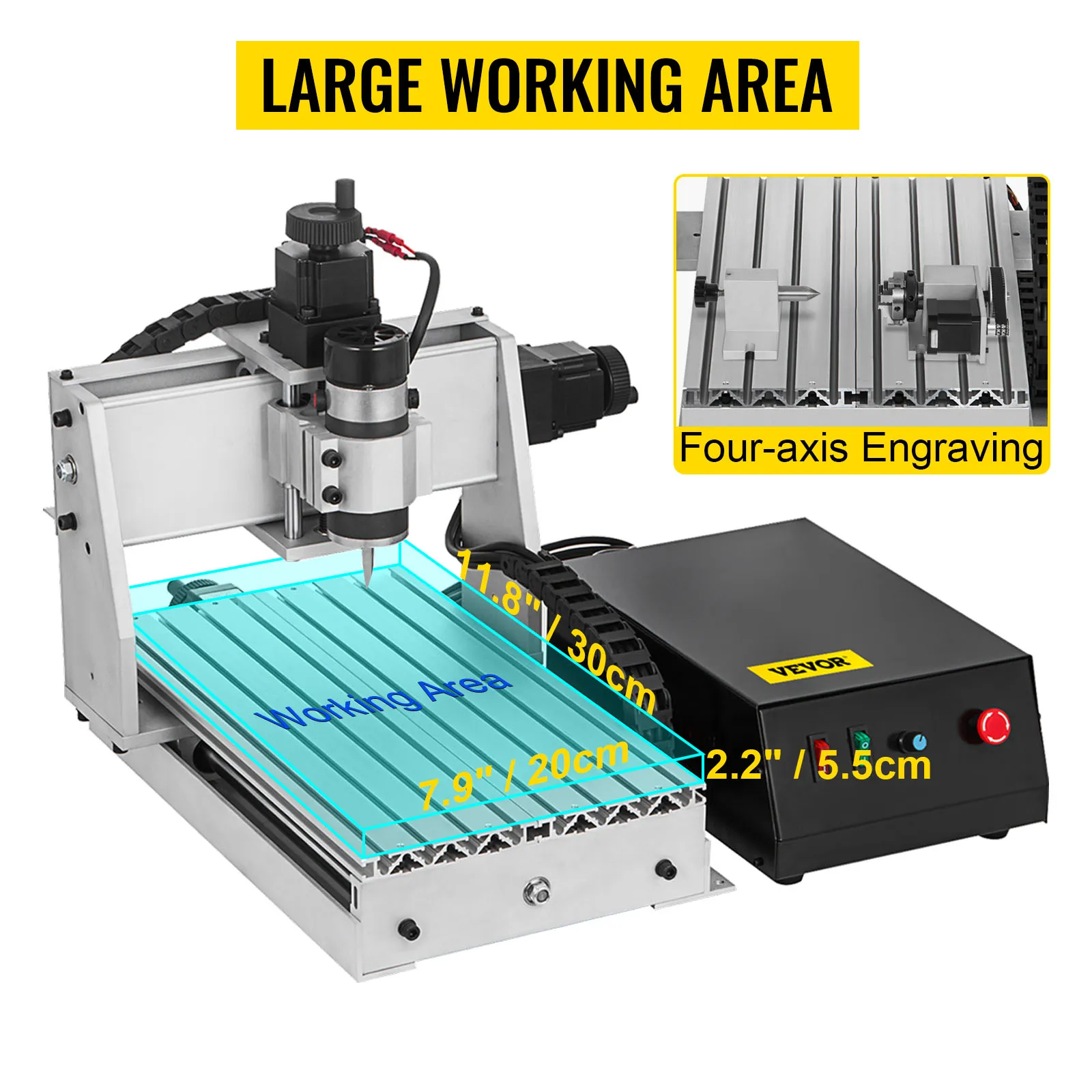 Hay 4 ejes de rotación para realizar el grabado estéreo 3D. El área de grabado efectiva de esta máquina de grabado es de 7,9 (X) x 11,8 (Y) x 2,2 (Z) pulgadas. Los ejes están equipados con perillas para ayudarlo a mover la máquina talladora manualmente, mejorando la eficiencia de trabajo.