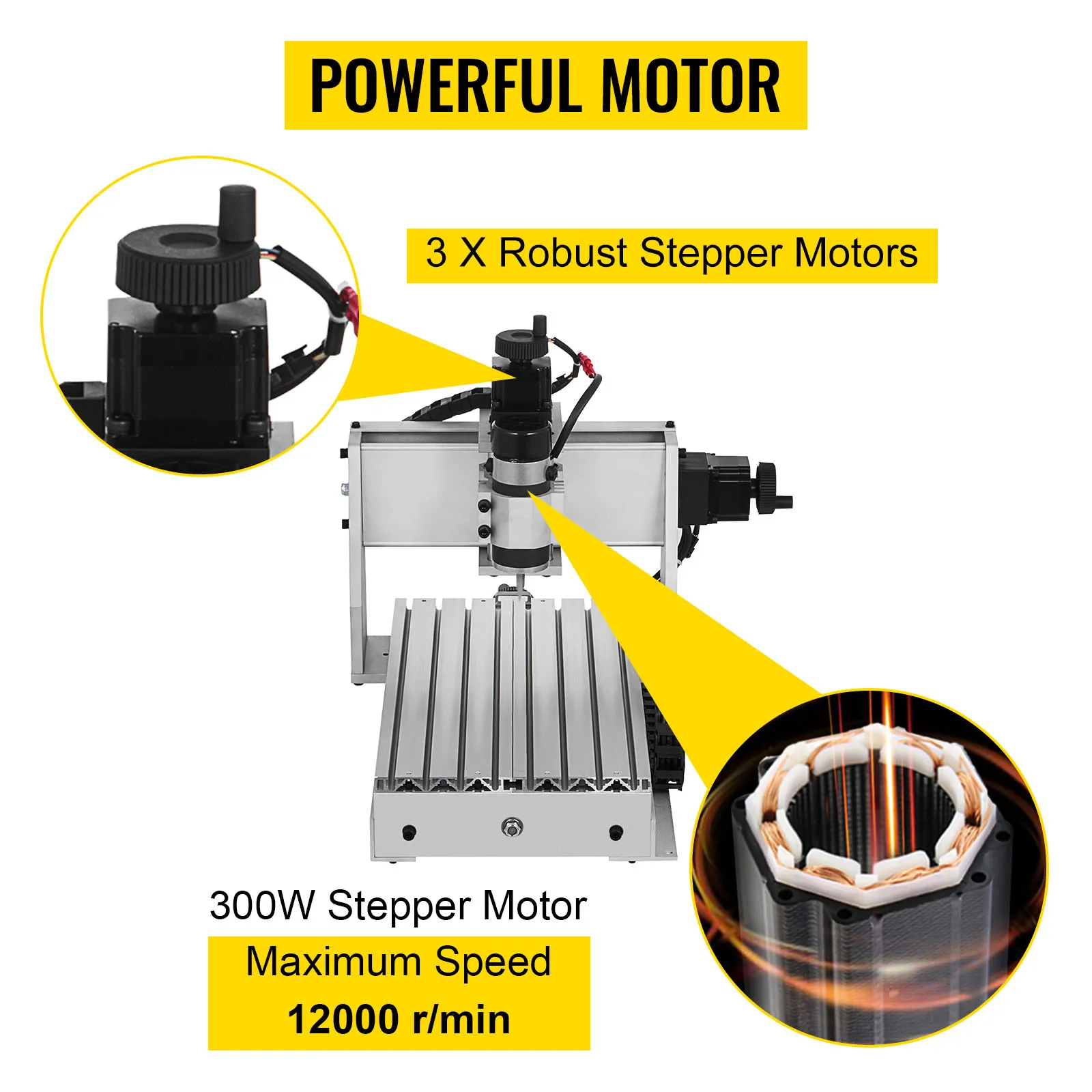 Hay tres motores paso a paso en tres ejes para un movimiento suave. El motor de eje de CC de 300 W en el eje Z puede alcanzar una velocidad de 12000 r/min.