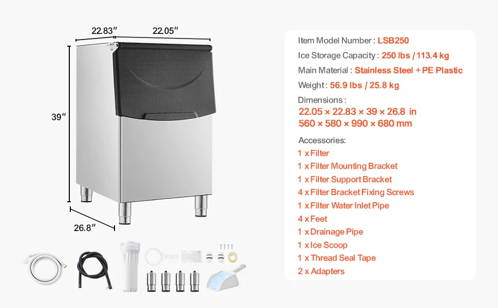 VEVOR Contenedor de Almacenamiento para Máquina de Hielo Capacidad de 250 libras Contenedor de Hielo de Acero Inoxidable con Filtro y Patas de Goma Antideslizantes para Restaurantes, Hoteles, Bares