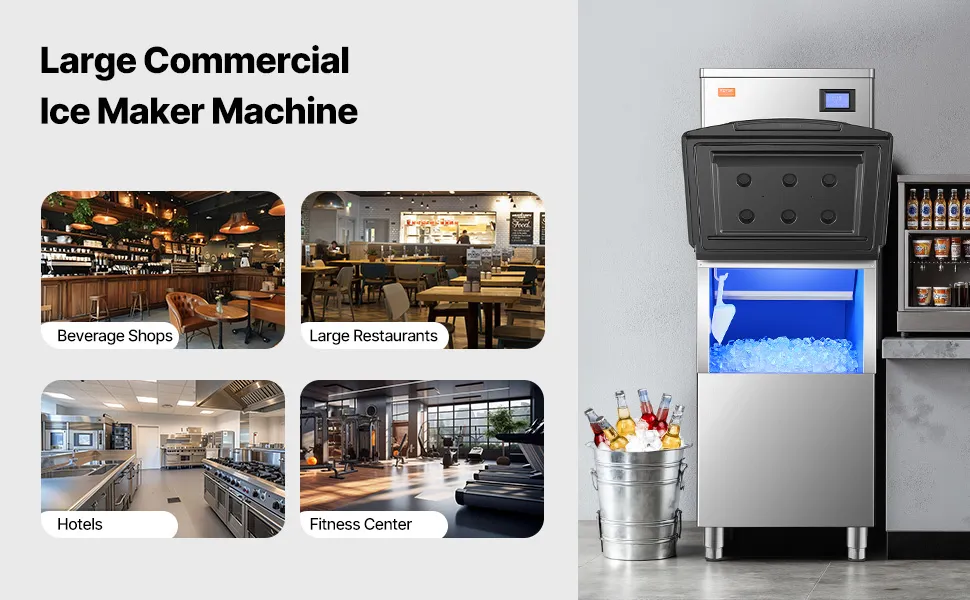 La máquina de cubitos de hielo proporciona una gran producción de hielo, lo que la hace ideal para cocinas comerciales, restaurantes, bares, hoteles y tiendas de bebidas.