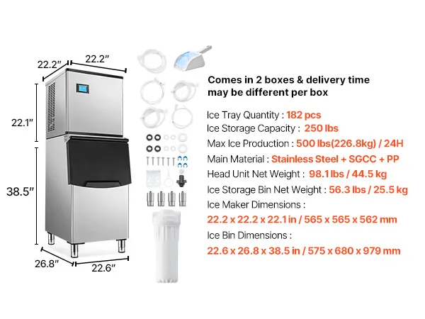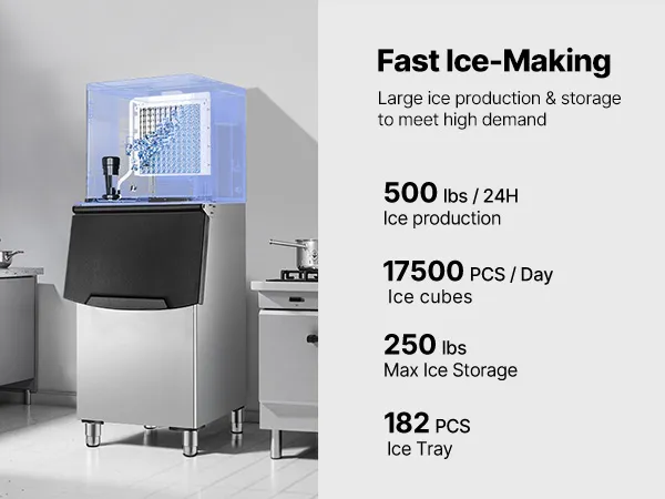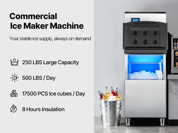 Gran producción de hielo: Esta máquina de hielo comercial puede producir 500 libras de hielo por 24 horas, con una gran capacidad de 250 libras y un excelente aislamiento, lo que garantiza un suministro continuo de hielo