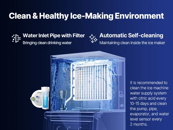 Fácil de limpiar: La máquina para fabricar hielo comercial cuenta con una función de autolimpieza de un solo toque, lo que le proporciona un entorno de fabricación de hielo limpio y saludable y garantiza que los cubitos de hielo estén limpios