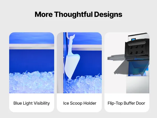 Panel de control inteligente: La pantalla táctil inteligente le permite ajustar el grosor del hielo y activar la función de autolimpieza con facilidad. Las luces indicadoras del panel brindan actualizaciones del estado de la máquina de hielo en tiempo real