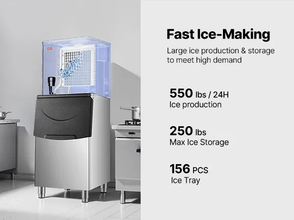 Fabricación rápida de hielo: Equipada con 156 bandejas de hielo, la máquina de hielo le permite ajustar el grosor del hielo modificando el tiempo de fabricación. El potente compresor puede producir hielo en 12 a 15 minutos