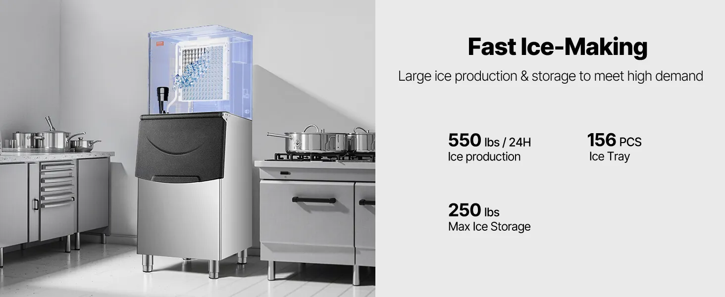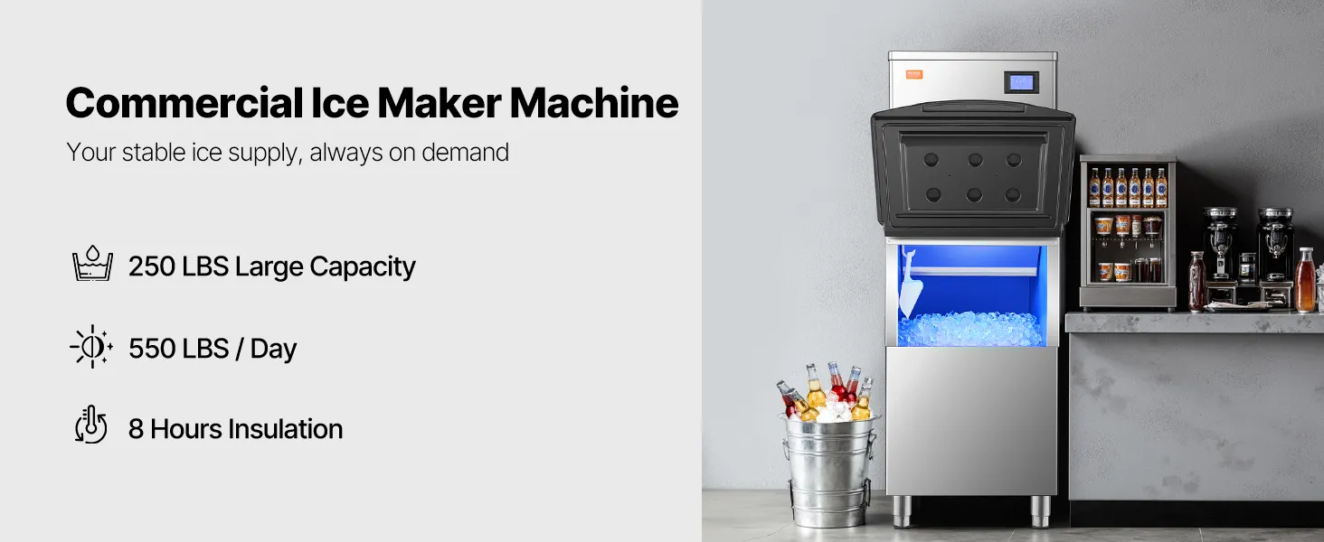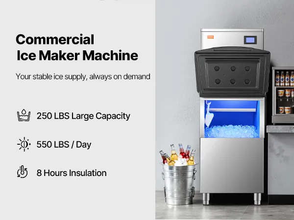 Gran producción de hielo: Esta máquina de hielo comercial puede producir 550 libras de hielo por 24 horas, con una gran capacidad de 250 libras y un excelente aislamiento, lo que garantiza un suministro continuo de hielo