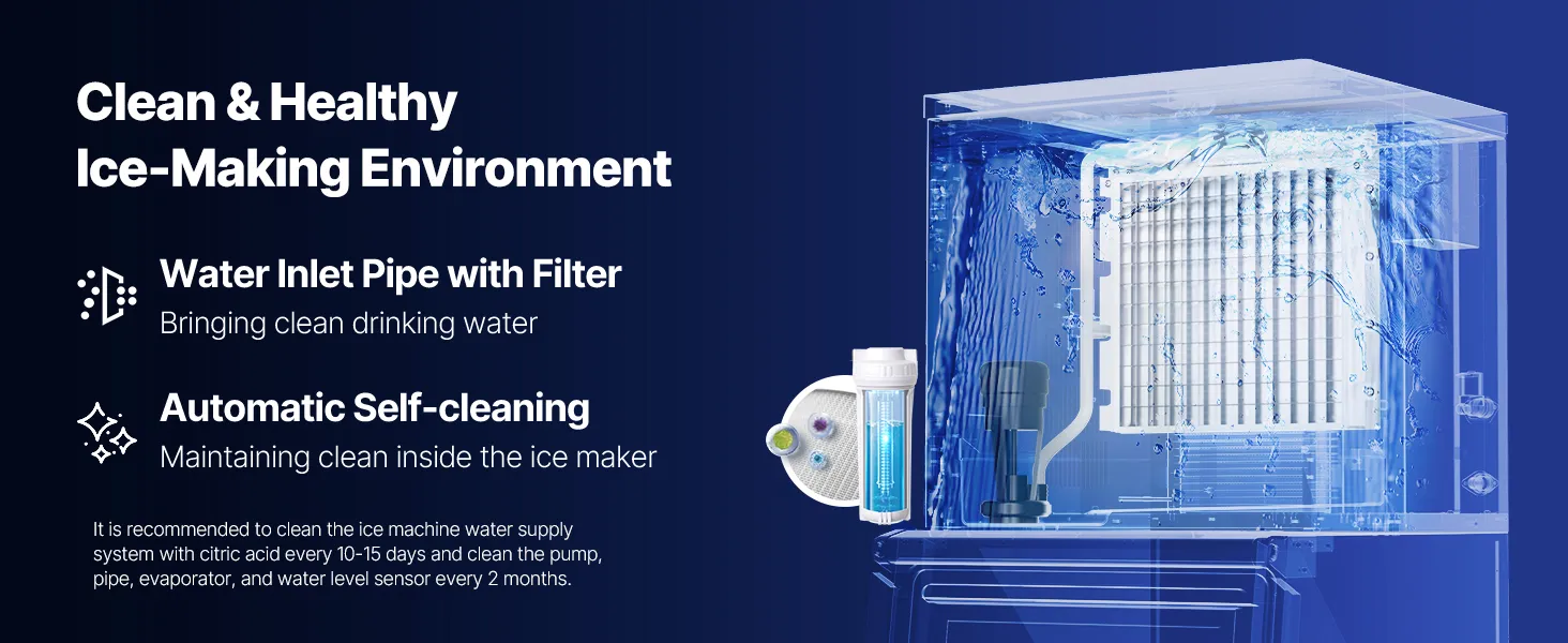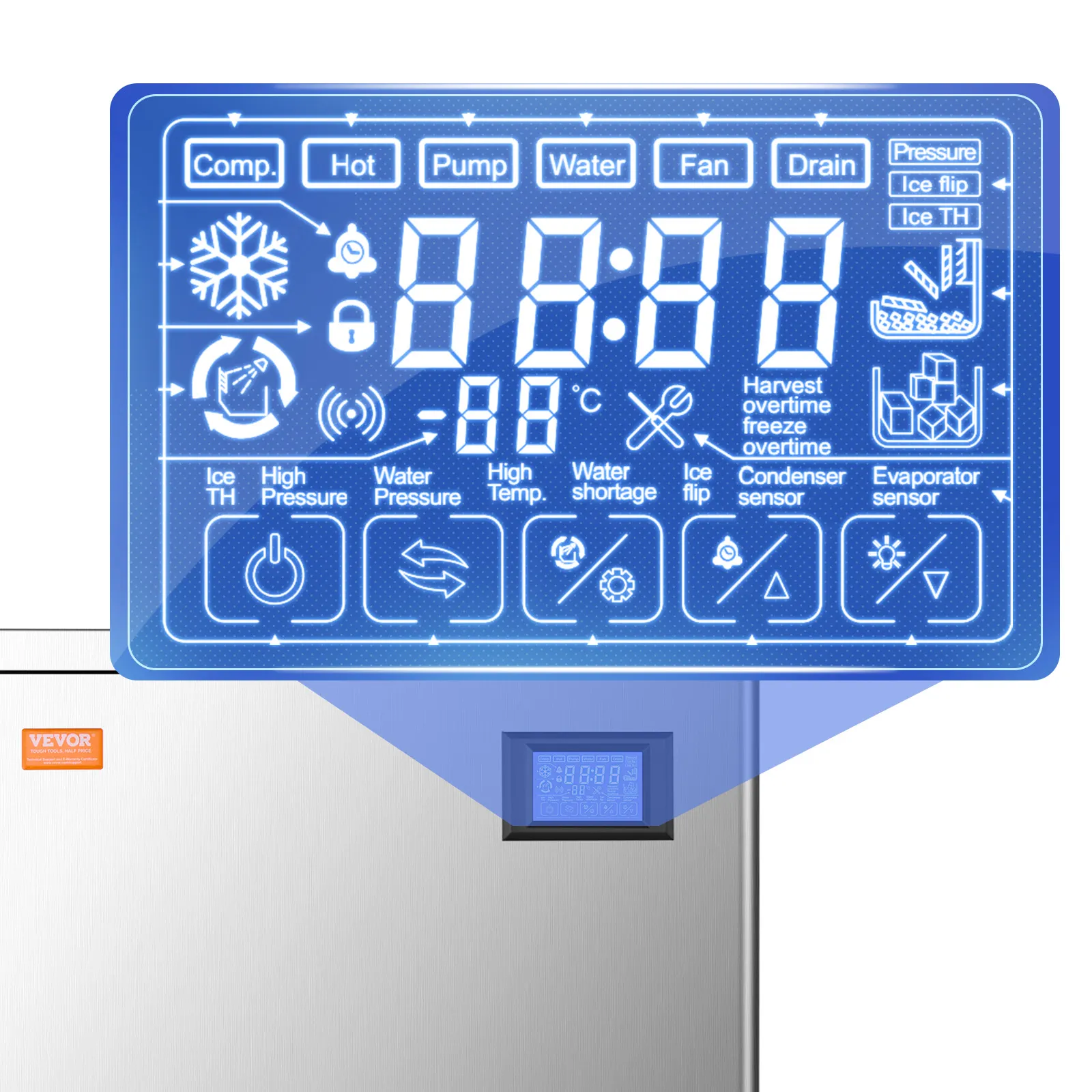 Panel de control inteligente: La pantalla táctil inteligente le permite ajustar el grosor del hielo y activar la función de autolimpieza con facilidad. Las luces indicadoras del panel brindan actualizaciones del estado de la máquina de hielo en tiempo real