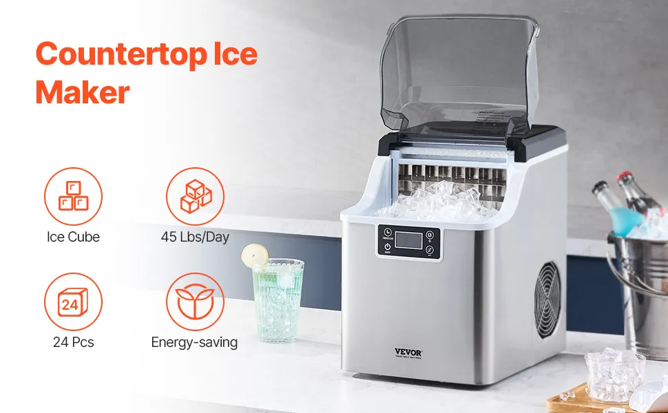 Esta máquina para fabricar hielo de encimera puede producir 45 libras de hielo cada 24 horas y 24 cubitos de hielo en tan solo 15 minutos. Con una capacidad de hielo de 2,6 libras/1,2 kg y un aislamiento duradero, siempre está lista para proporcionar hielo limpio.