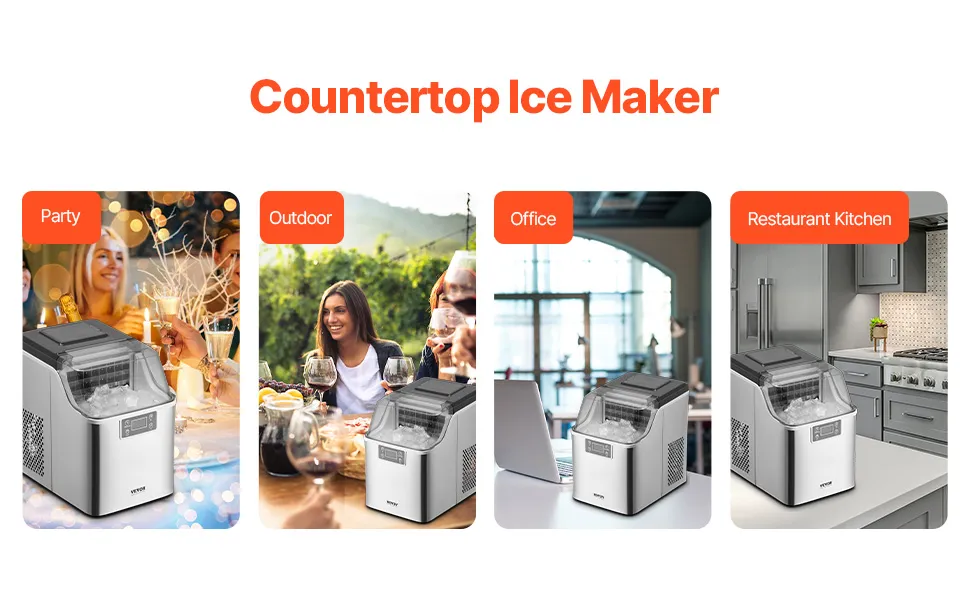 Silencioso y portátil: La máquina de hielo de encimera funciona con un nivel de ruido inferior a 42 dB, similar al sonido de un refrigerador en funcionamiento. El diseño compacto incluye un asa y mide 10 x 14 x 15,2 pulgadas/255 x 355 x 385 mm, lo que la hace adecuada para su uso en habitaciones, oficinas, restaurantes y más