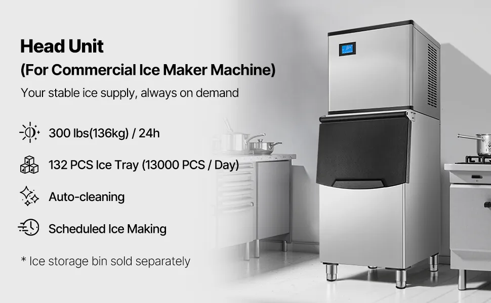 Gran producción de hielo: La máquina para fabricar hielo comercial (cabezal) puede producir 300 libras de hielo cada 24 horas, lo que proporciona un suministro continuo de hielo en grandes cantidades