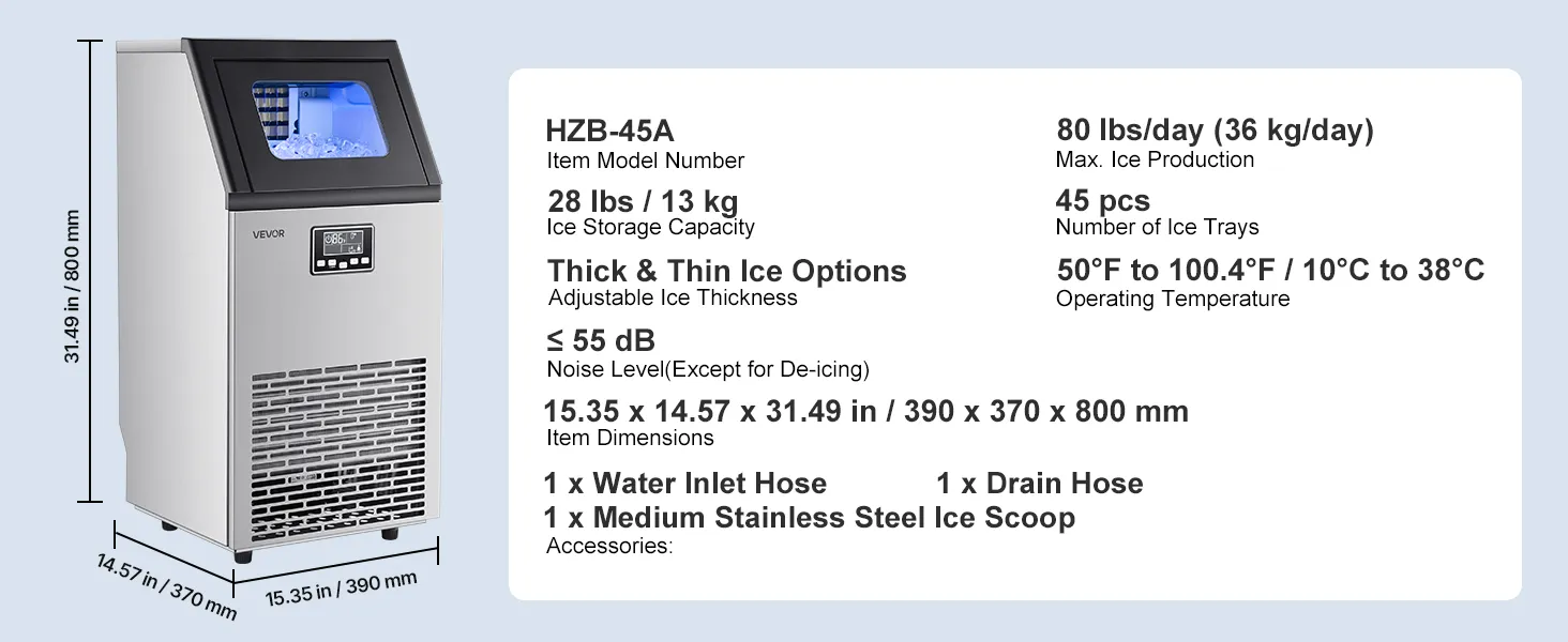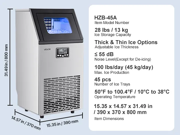 Fabricación eficiente de hielo: La máquina de hielo comercial produce 45 cubos por ciclo y hasta 45 kg de hielo al día, con una capacidad de almacenamiento de 12 kg. Ideal para uso doméstico, en bares o en comercios ligeros. Certificación ETL y ENERGY STAR para un rendimiento seguro y eficiente