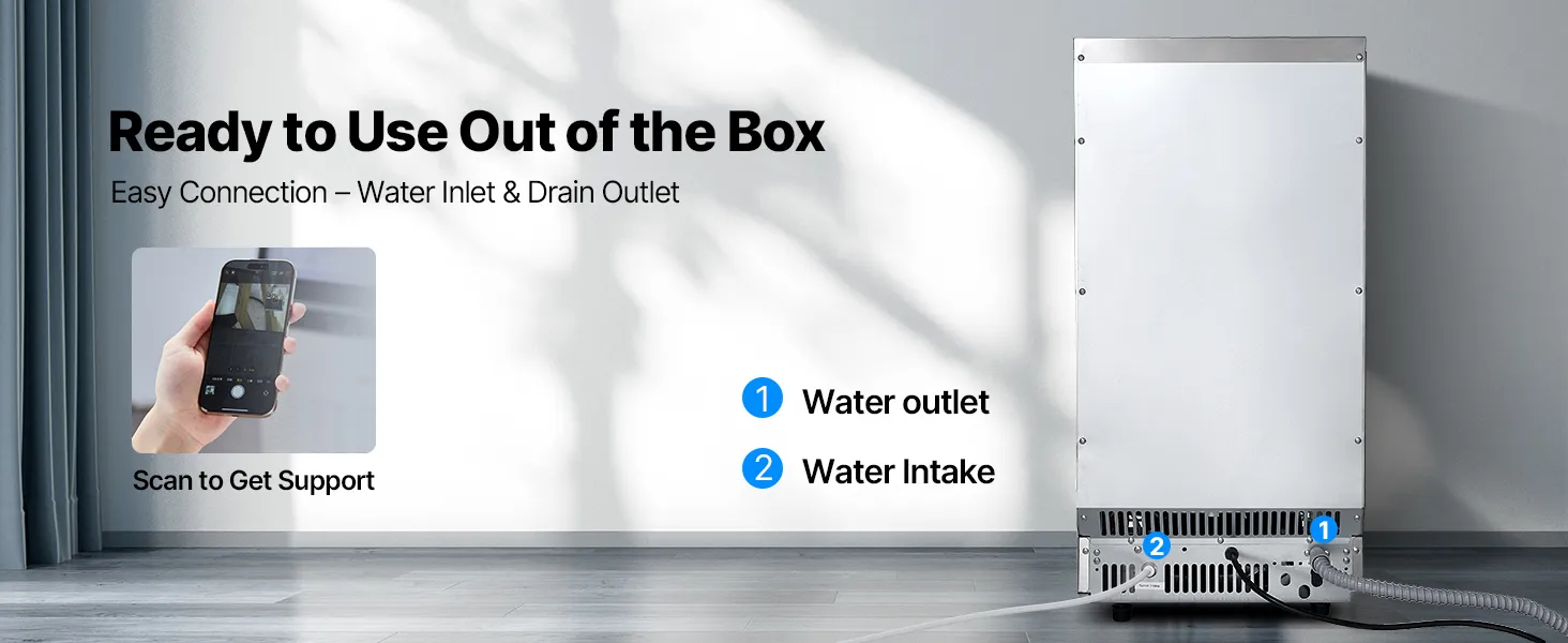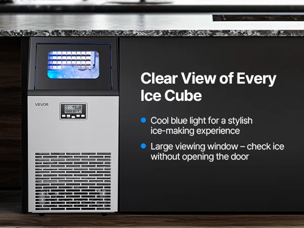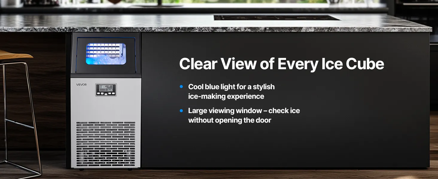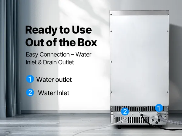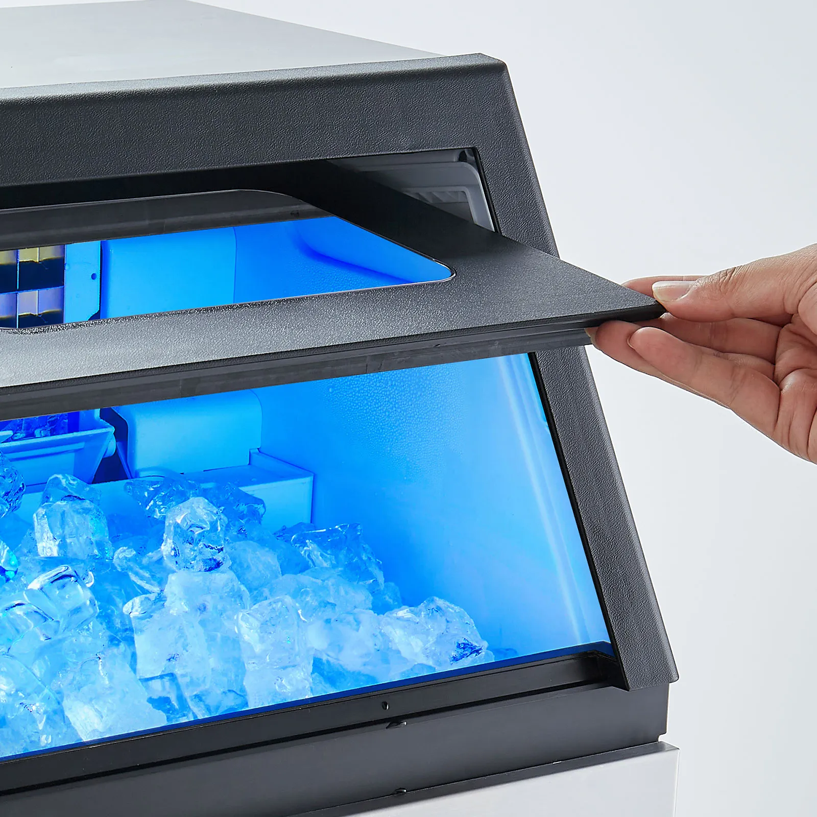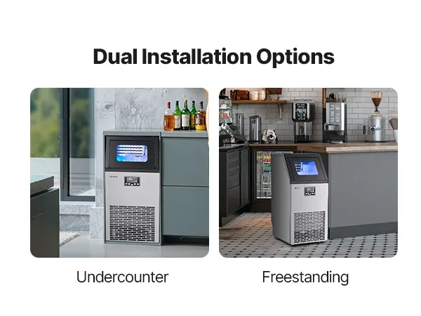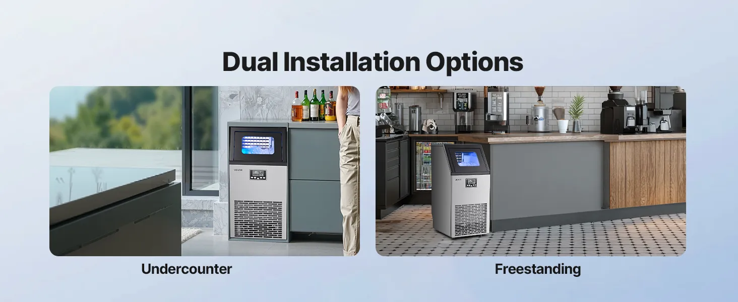 Instalación rápida: No requiere retirar la película; esta máquina de hielo bajo encimera está lista para usar. Independiente o empotrada, su elegante diseño se integra a la perfección en cocinas, bares o cualquier espacio que requiera una ubicación flexible