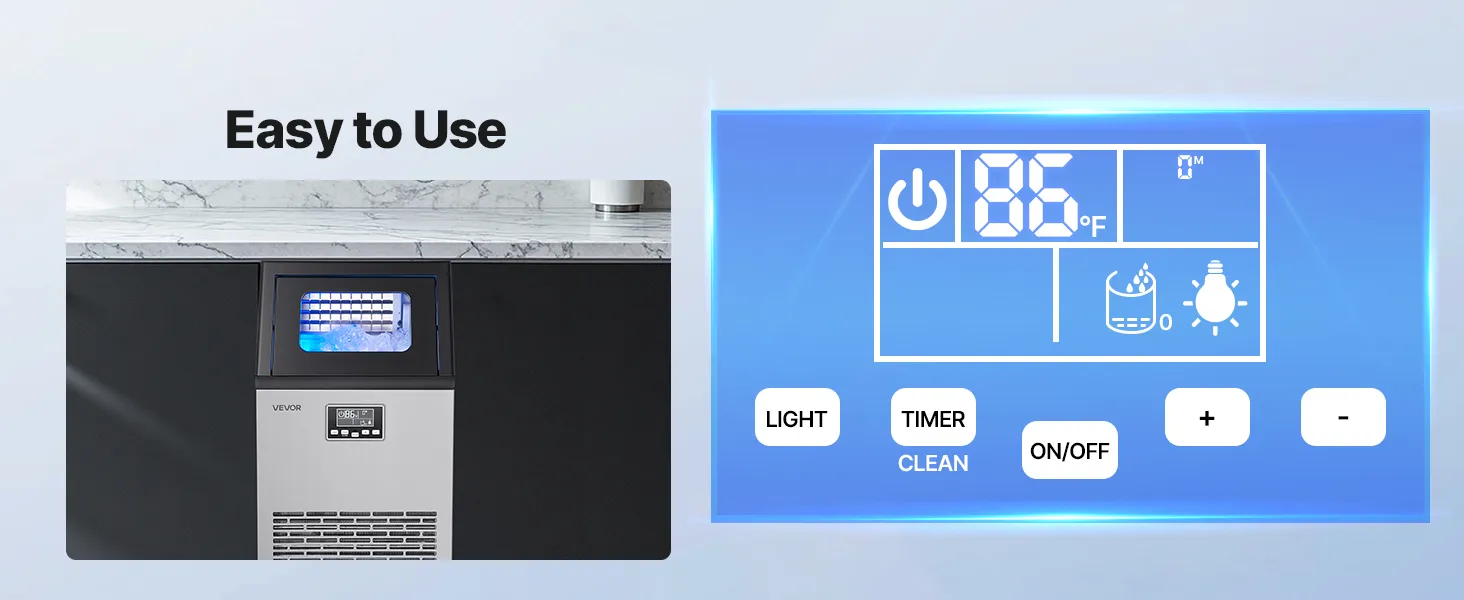 Fácil de usar: Esta máquina para hacer hielo cuenta con controles LED intuitivos; simplemente seleccione cubitos gruesos o delgados con un solo toque. La amplia ventana de visualización y la iluminación interior azul le permiten monitorear el proceso de fabricación de hielo sin abrir la tapa