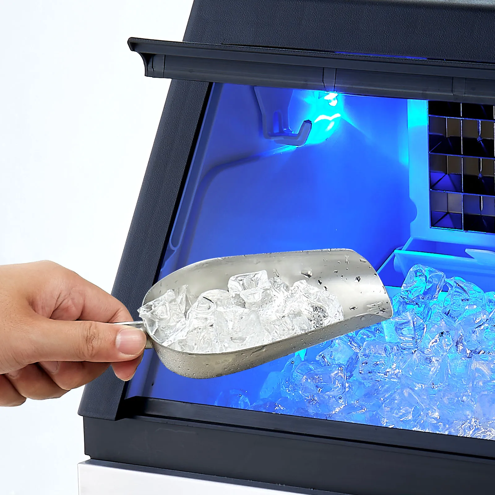 La cuchara de acero inoxidable de calidad alimentaria garantiza una manipulación segura e higiénica del hielo en todo momento.