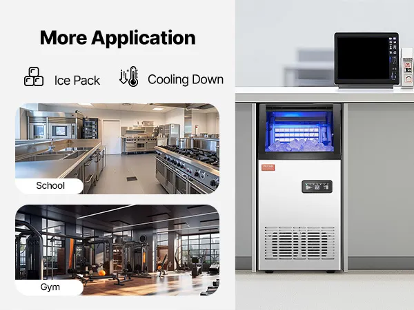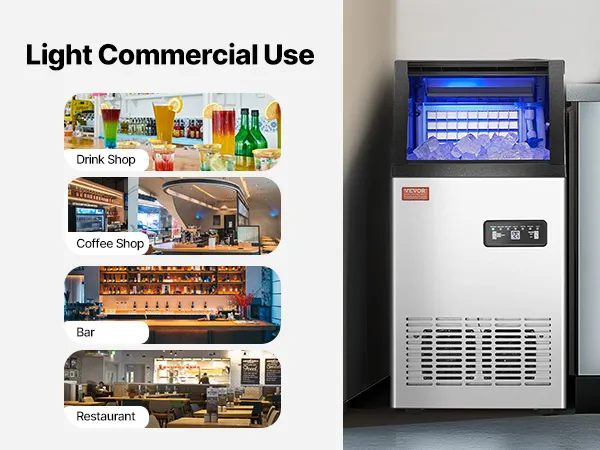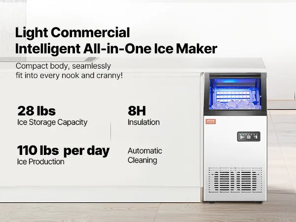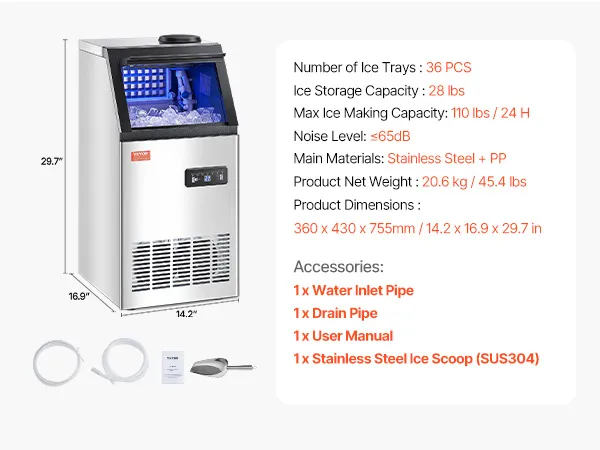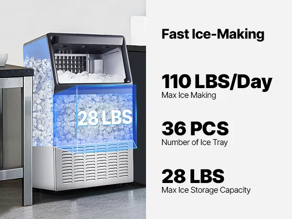 Máquina para hacer hielo comercial: Nuestra máquina para hacer hielo comercial está diseñada con 36 bandejas de hielo y puede producir hasta 110 libras (aprox. 49,9 kg) de cubitos de hielo por día (condiciones de prueba: temperatura ambiente de 50 a 100,4 °F/10 a 38 °C). Esta máquina para hacer hielo compacta tiene una generosa capacidad de almacenamiento de 28 libras (aprox. 12,7 kg) y se adapta perfectamente a su hogar, cafetería, bar, restaurante y más
